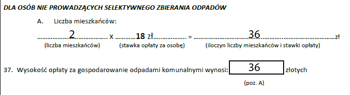 przykład 2: dwuosobowe gospodarstwo domowe oddaje odpady zmieszane w jednym pojemniku o pojemności 120 litrów , wobec czego za wywóz śmieci płaci miesięcznie 36 zł