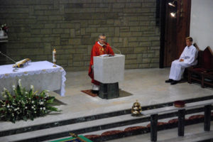 Ceremonia związana z objęciem nowego sztandaru rozpoczęła się o godz. 15.00, od uroczystej Mszy Świętej sprawowanej w intencji strażaków i ich rodzin w kościele parafialnym pod wezwaniem Podwyższenia Krzyża Świętego w Gostyni. Eucharystię sprawował ks. prob. Henryk Nowara. W homilii, którą wygłosił, odniósł się zarówno do postaci św. Floriana – patrona strażaków, bezinteresownej i ogromnie ważnej dla społeczeństwa służby strażaków ochotników, jak i roli sztandaru w życiu jednostki.