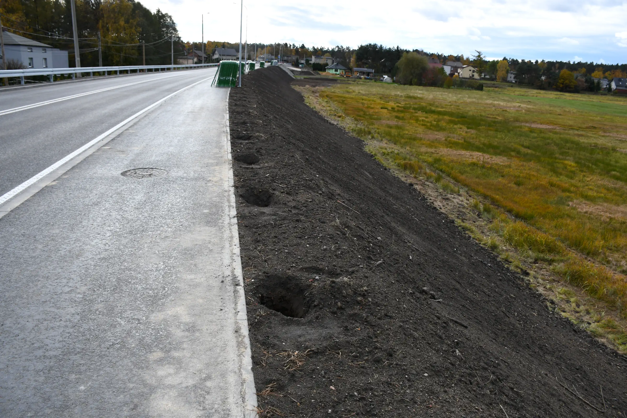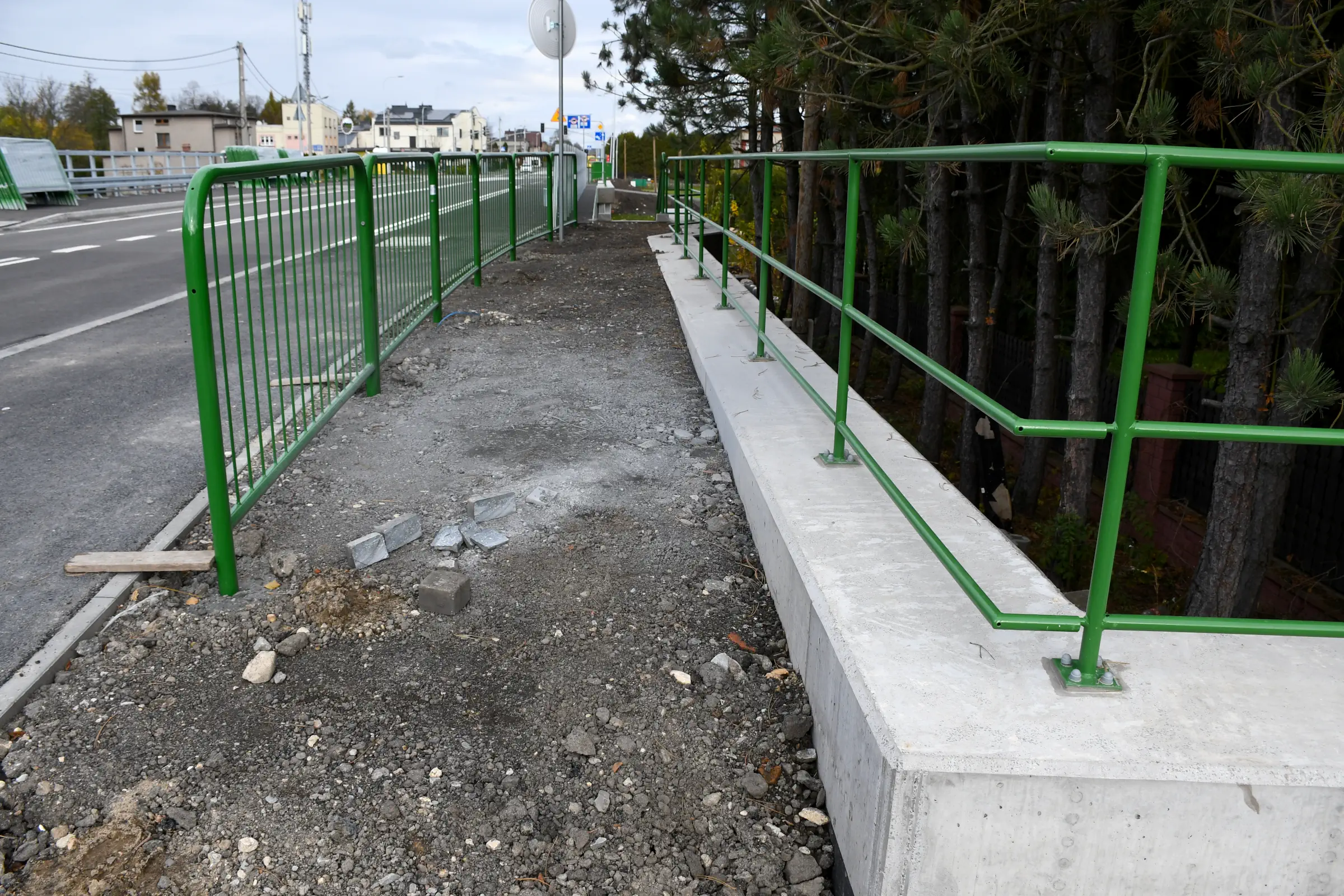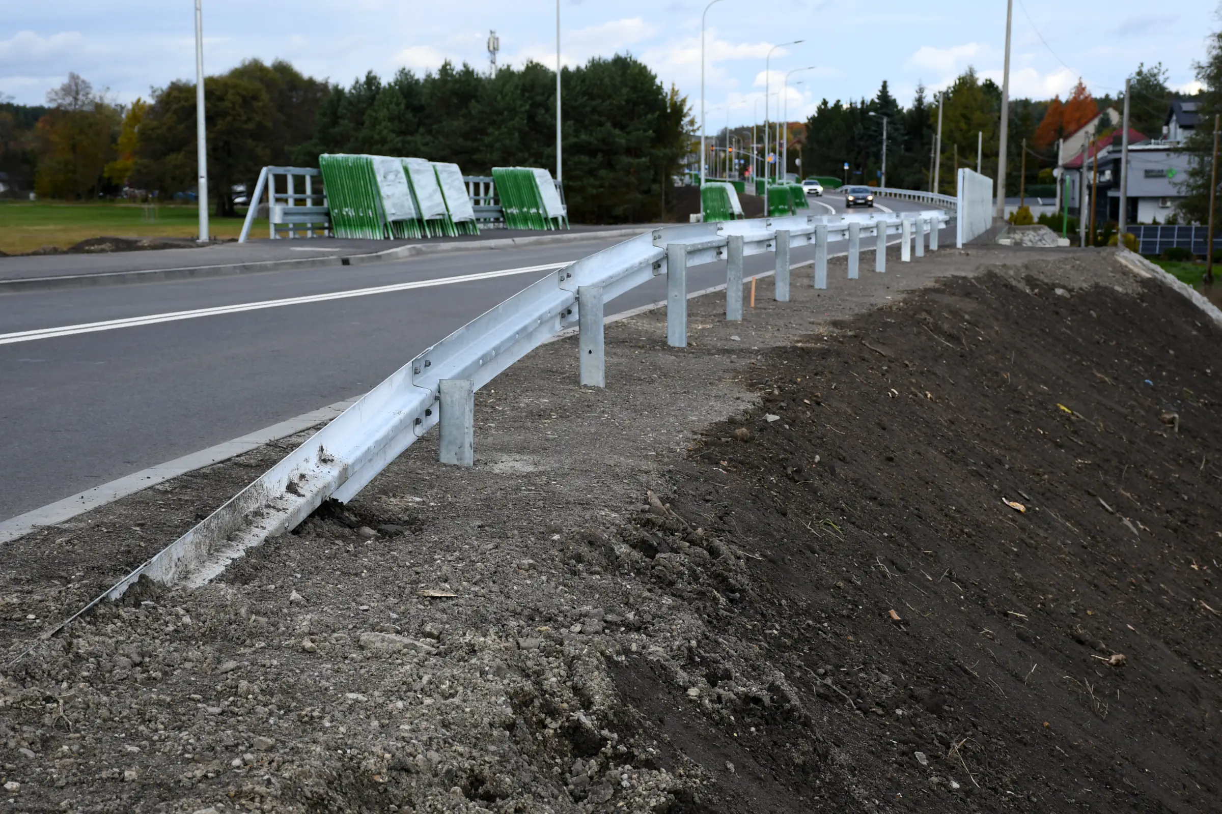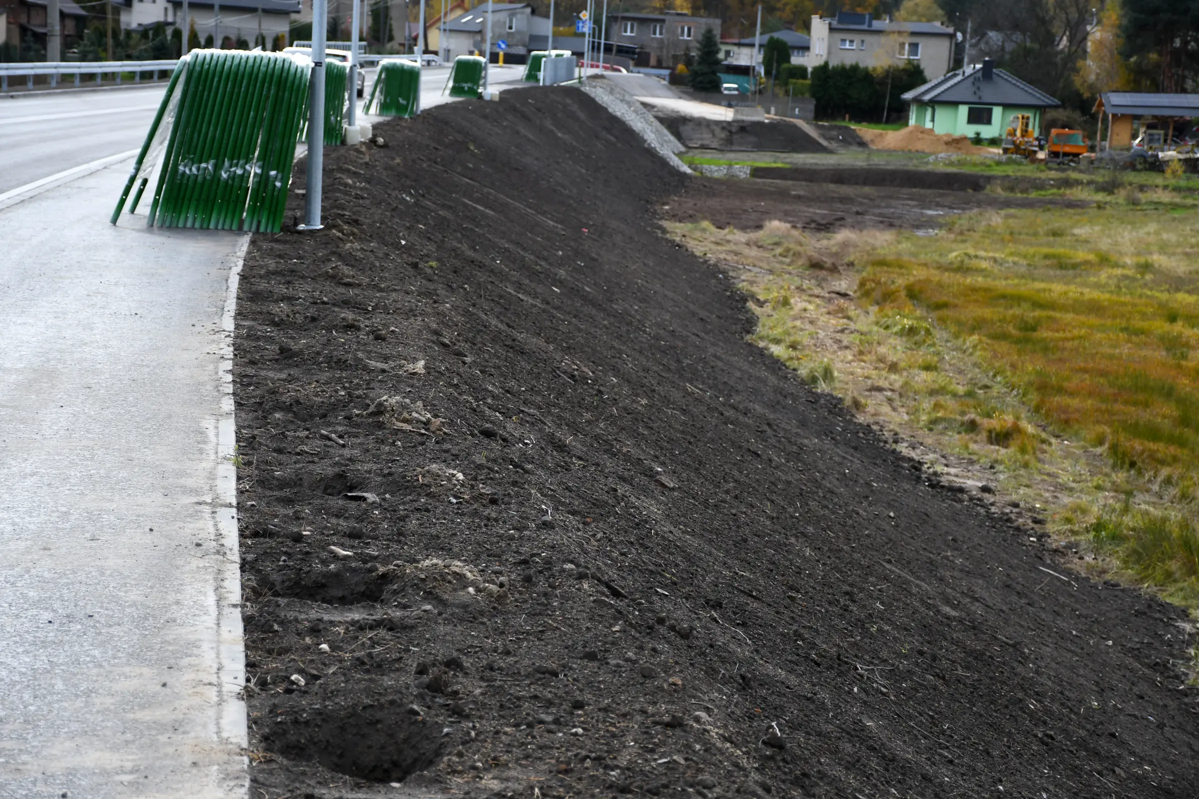 5. Dużo działo się też na odcinku pomiędzy mostem nad ciekiem „S” a mostem nad Gostynką. W pierwszej połowie miesiąca ułożono warstwę ścieralną na jezdni głównej (obie strony), ciągu pieszo-rowerowym po stronie zachodniej oraz na zjazdach do dróg publicznych (w tym ul. Pszczyńska boczna – przy Munimentum Point), a także zainstalowano słupy oświetlenia ulicznego wraz z oprawami. W drugiej połowie października uformowano ostatecznie skarpy po obu stronach i cały teren obsiano trawą. Ponadto zamontowano bariery drogowe – strona zachodnia, tj. wzdłuż ciągu pieszo-rowerowego) i bariery energochłonne (strona wschodnia).