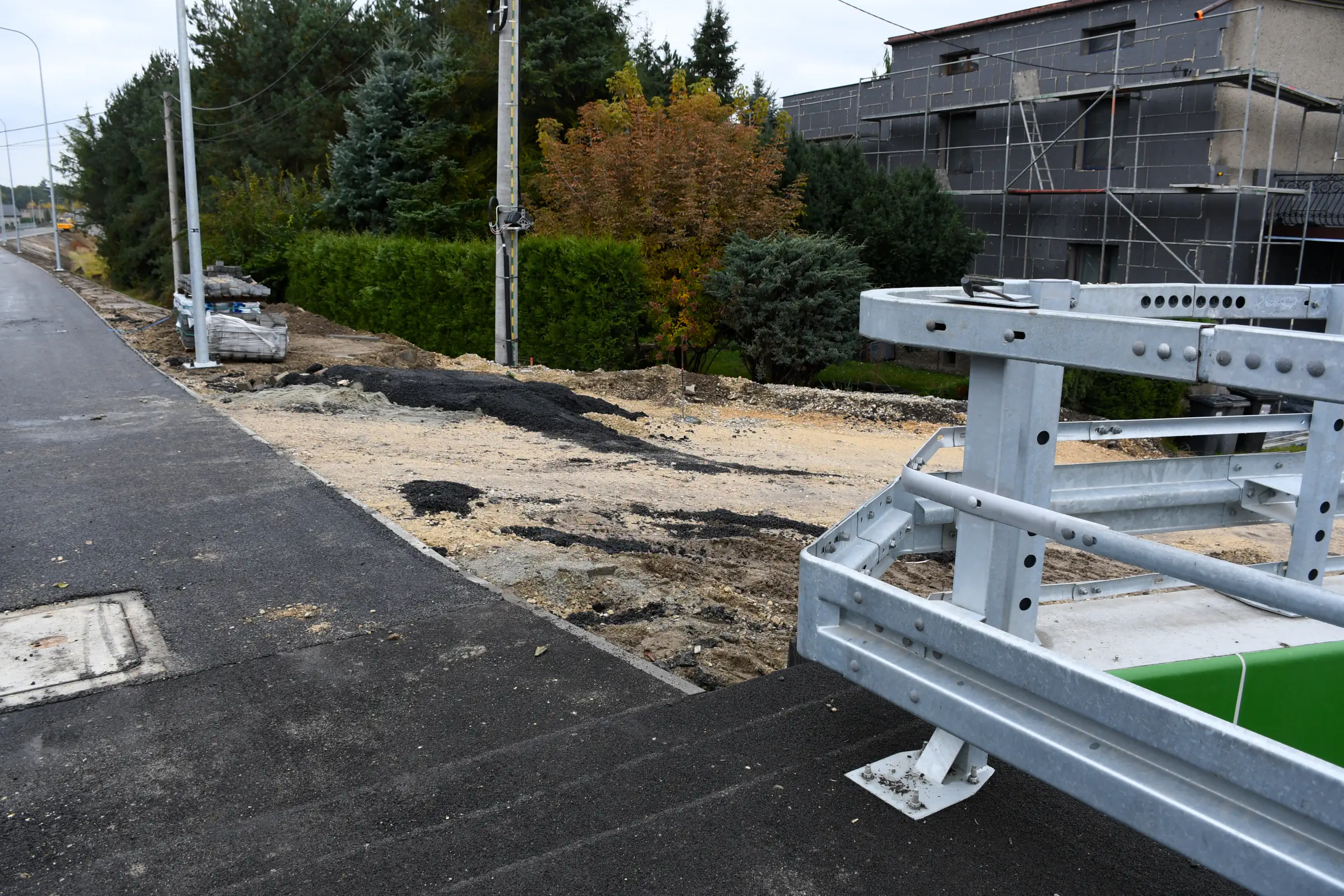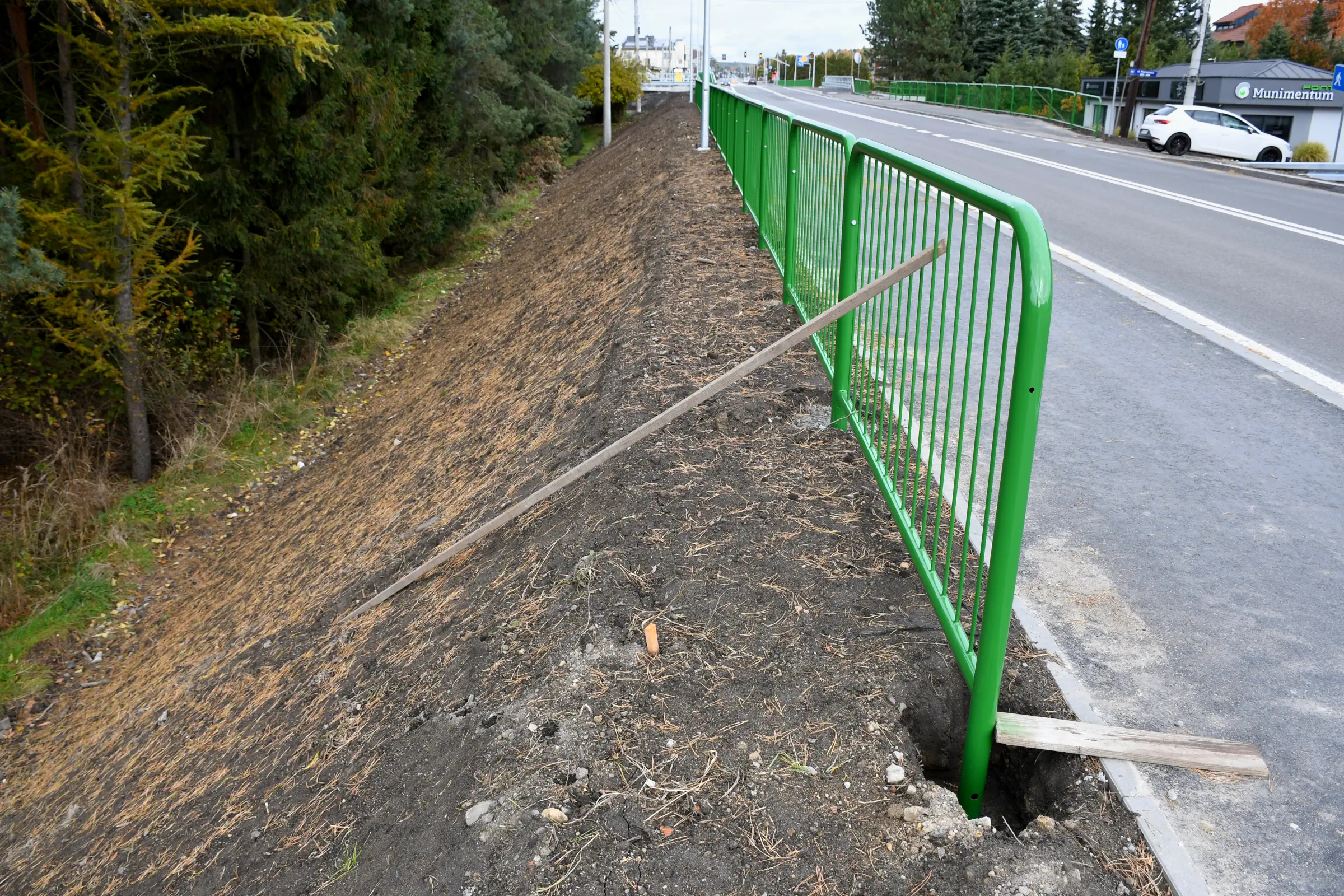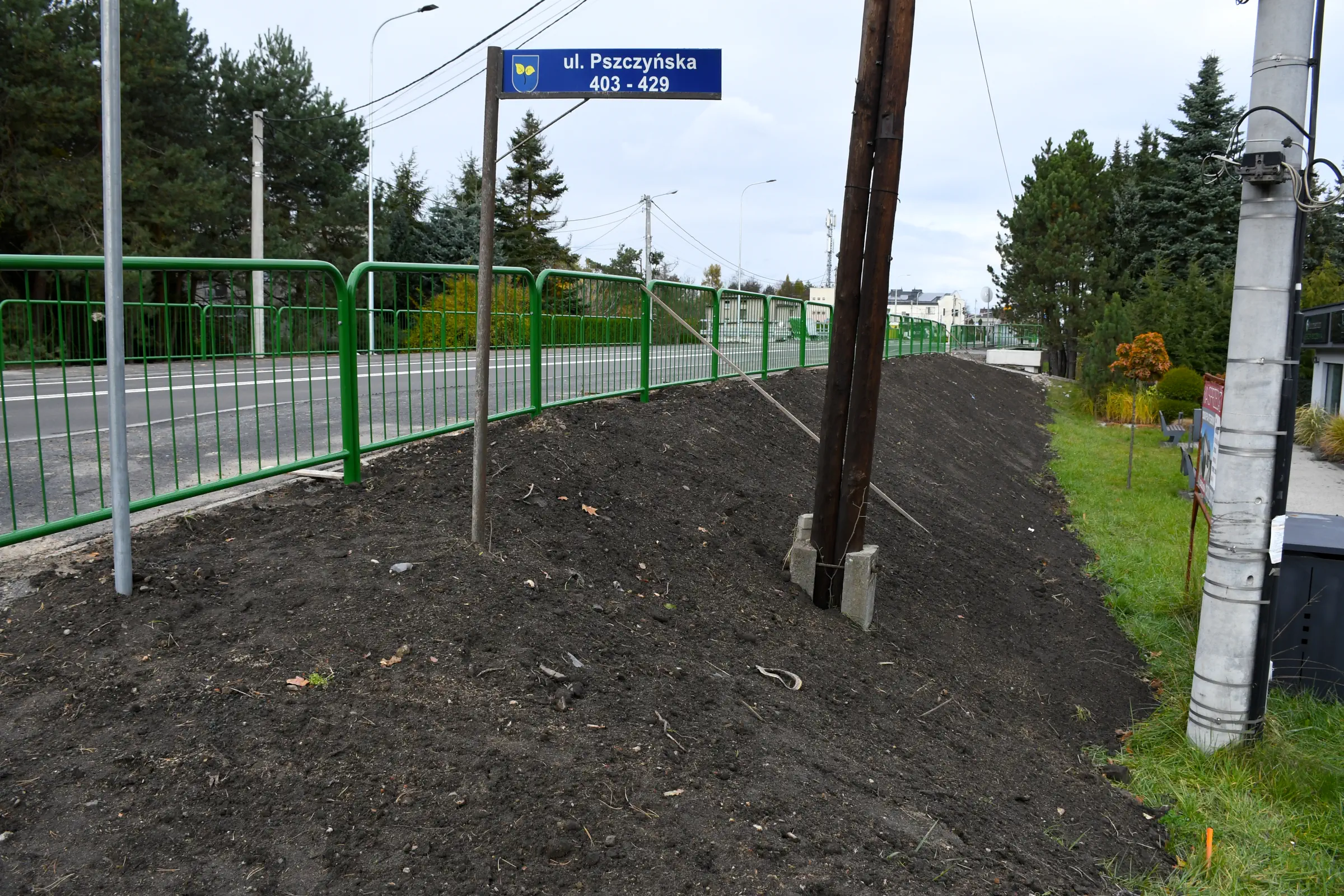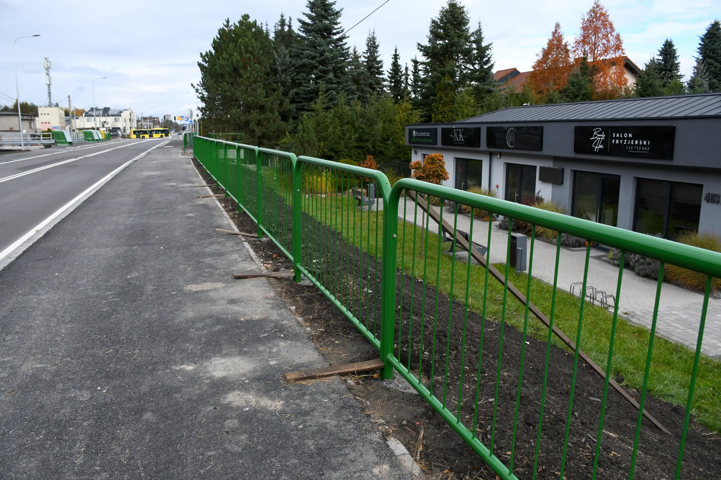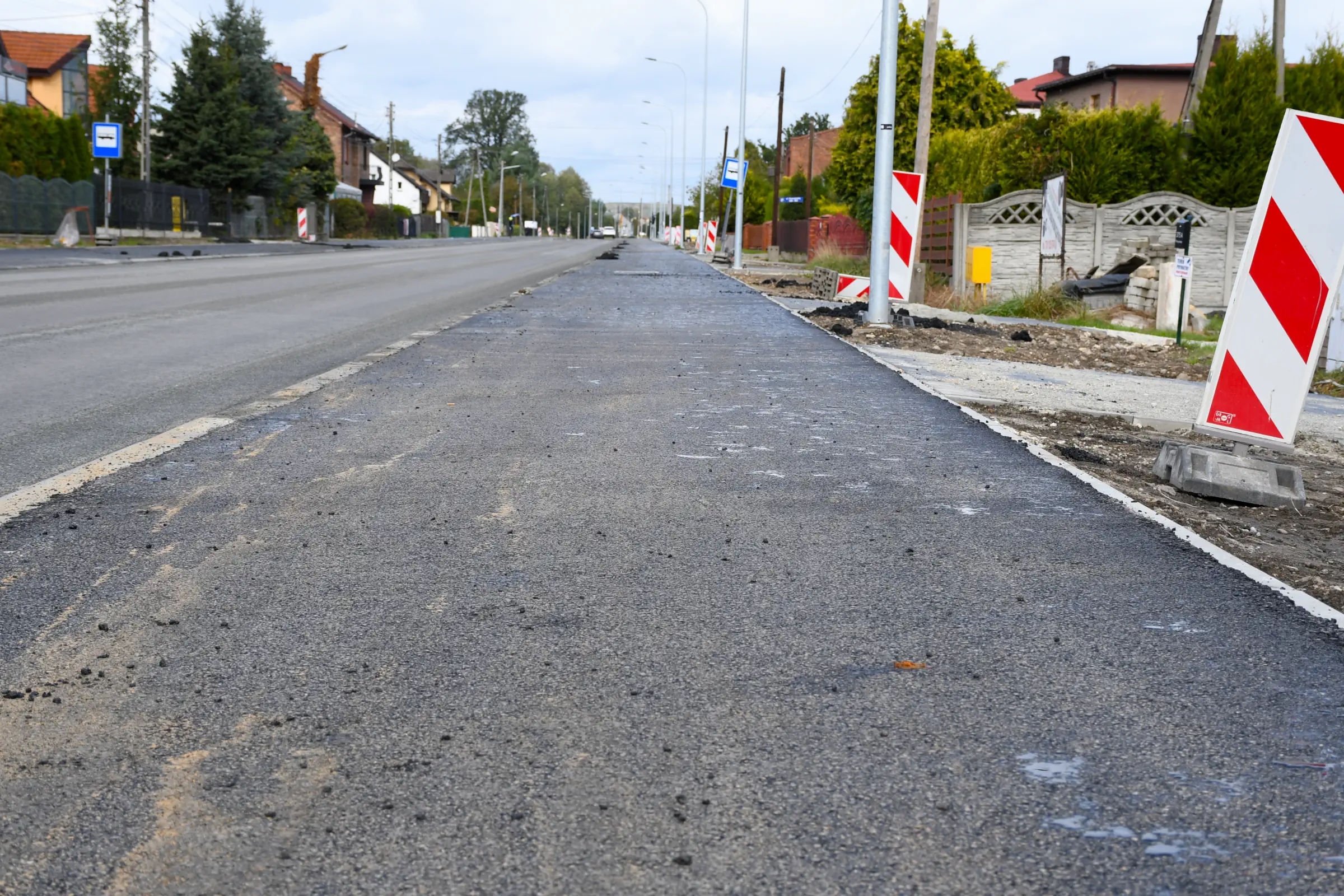 5. Dużo działo się też na odcinku pomiędzy mostem nad ciekiem „S” a mostem nad Gostynką. W pierwszej połowie miesiąca ułożono warstwę ścieralną na jezdni głównej (obie strony), ciągu pieszo-rowerowym po stronie zachodniej oraz na zjazdach do dróg publicznych (w tym ul. Pszczyńska boczna – przy Munimentum Point), a także zainstalowano słupy oświetlenia ulicznego wraz z oprawami. W drugiej połowie października uformowano ostatecznie skarpy po obu stronach i cały teren obsiano trawą. Ponadto zamontowano bariery drogowe – strona zachodnia, tj. wzdłuż ciągu pieszo-rowerowego) i bariery energochłonne (strona wschodnia).