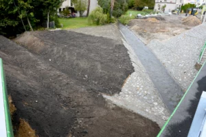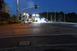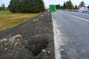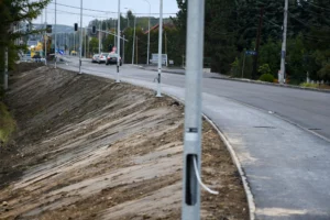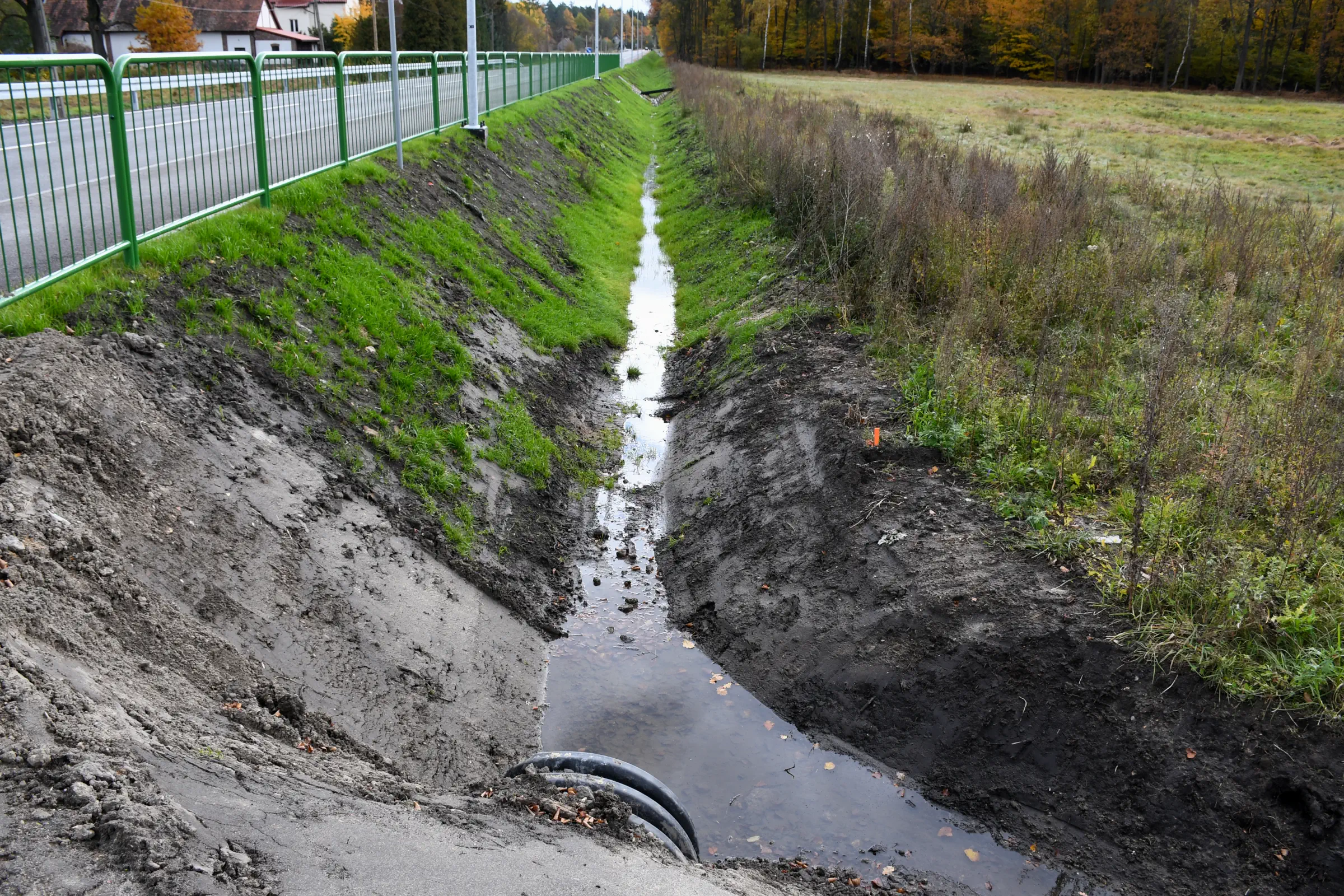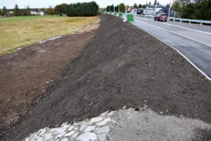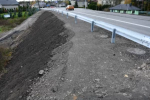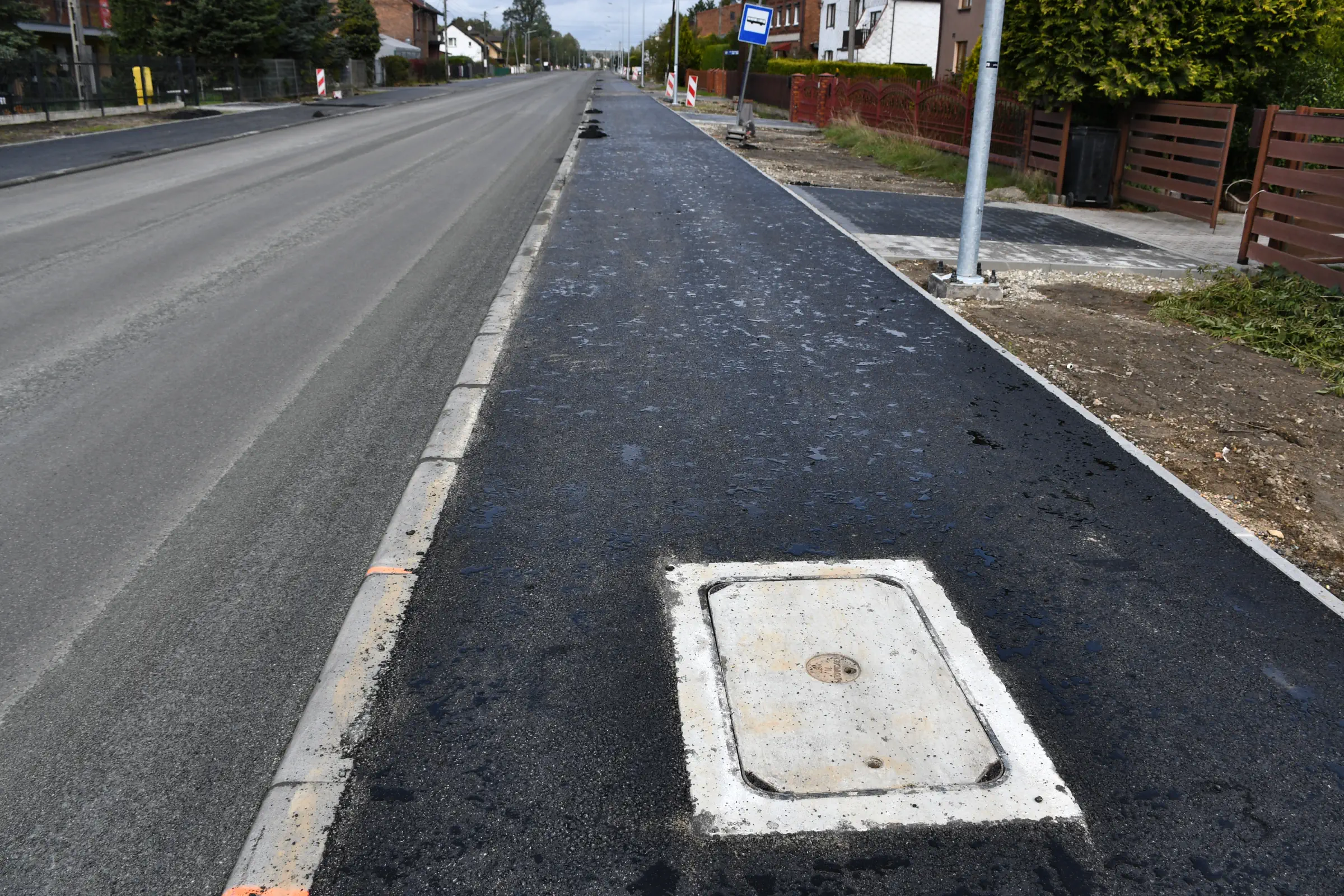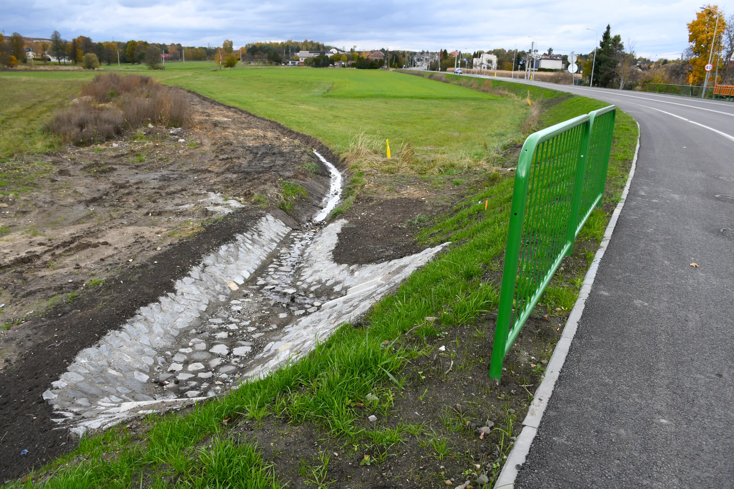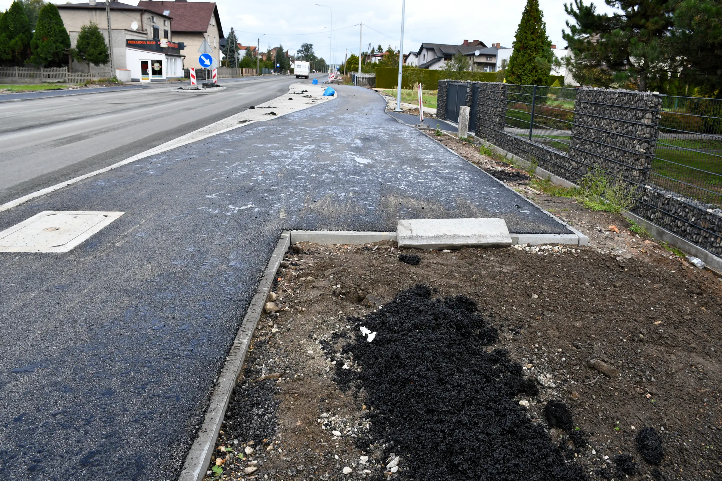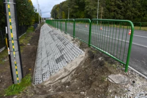5. Dużo działo się też na odcinku pomiędzy mostem nad ciekiem „S” a mostem nad Gostynką. W pierwszej połowie miesiąca ułożono warstwę ścieralną na jezdni głównej (obie strony), ciągu pieszo-rowerowym po stronie zachodniej oraz na zjazdach do dróg publicznych (w tym ul. Pszczyńska boczna – przy Munimentum Point), a także zainstalowano słupy oświetlenia ulicznego wraz z oprawami. W drugiej połowie października uformowano ostatecznie skarpy po obu stronach i cały teren obsiano trawą. Ponadto zamontowano bariery drogowe – strona zachodnia, tj. wzdłuż ciągu pieszo-rowerowego) i bariery energochłonne (strona wschodnia).