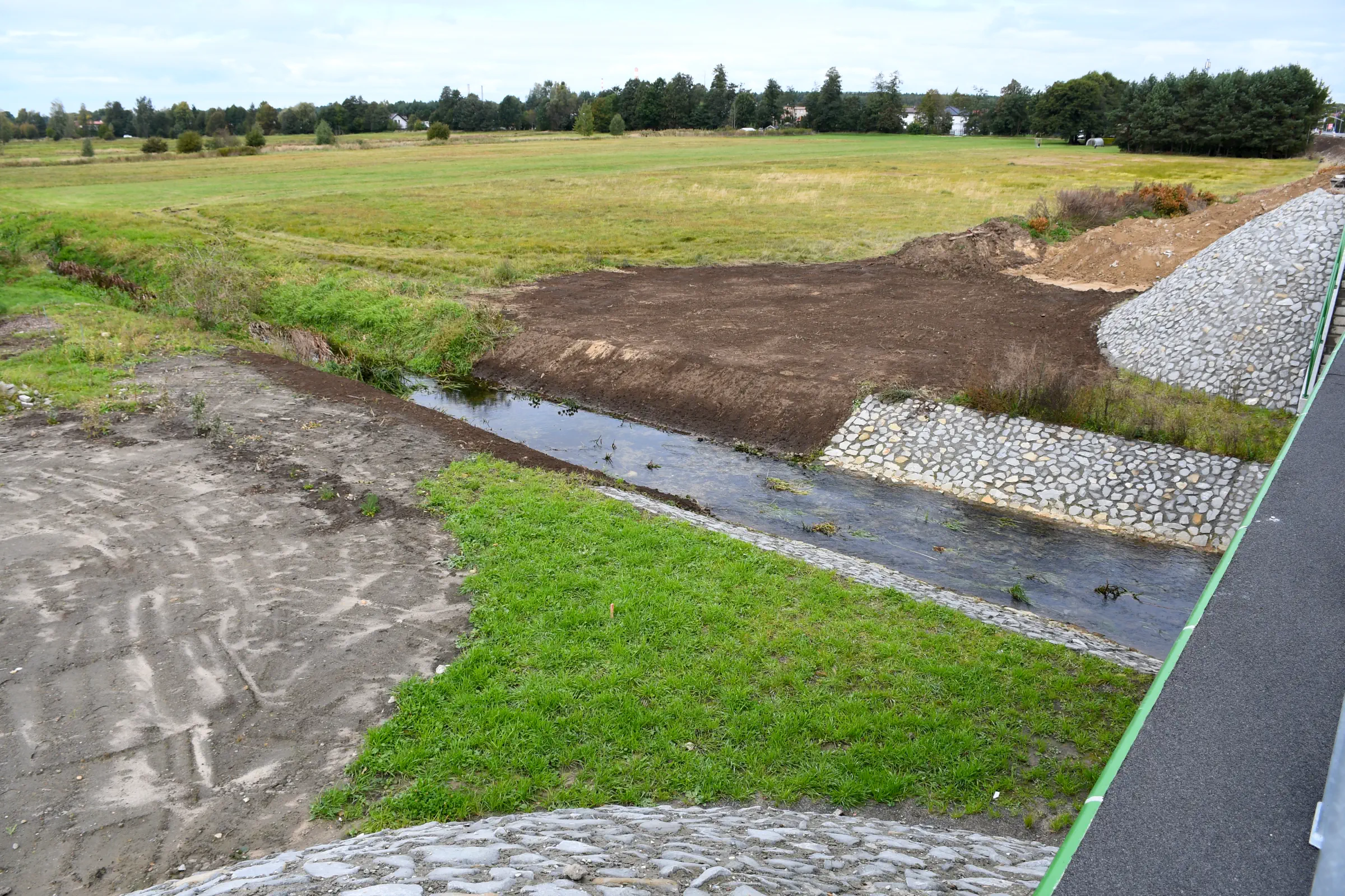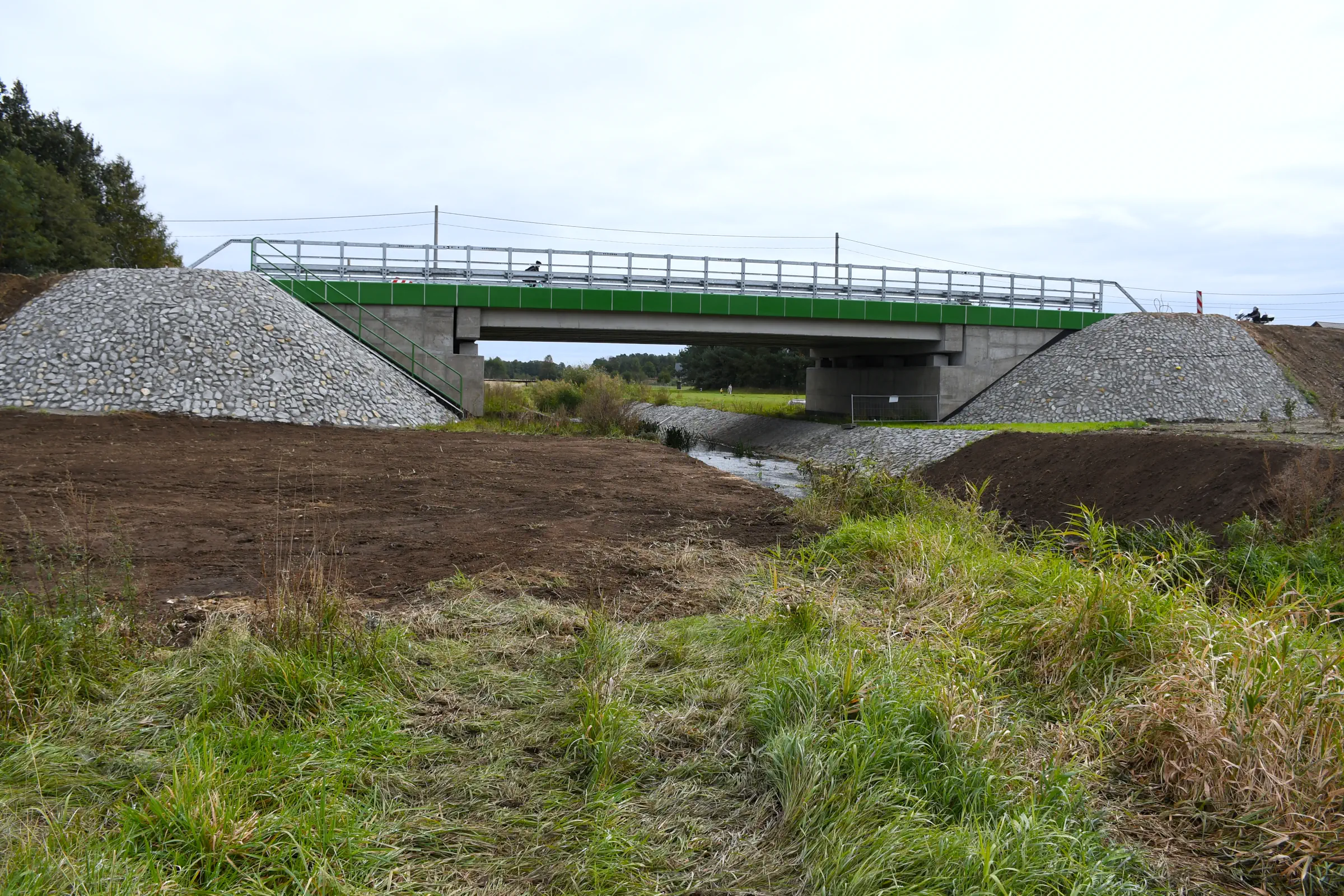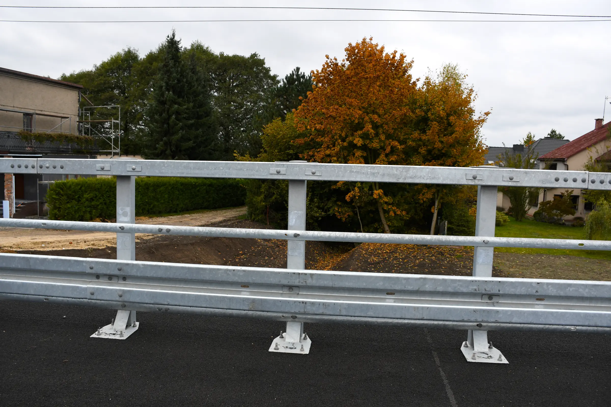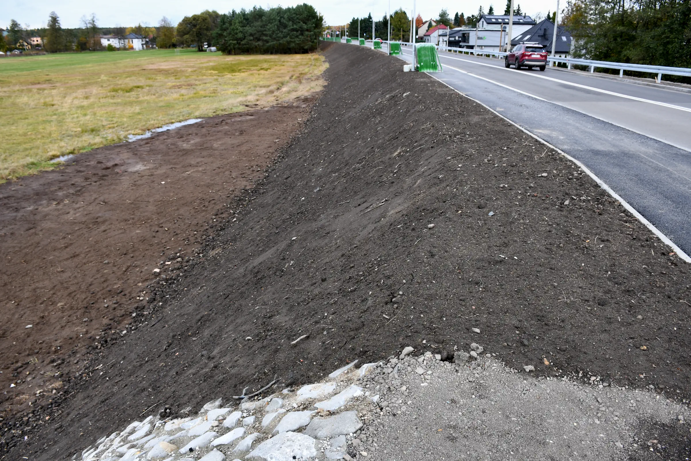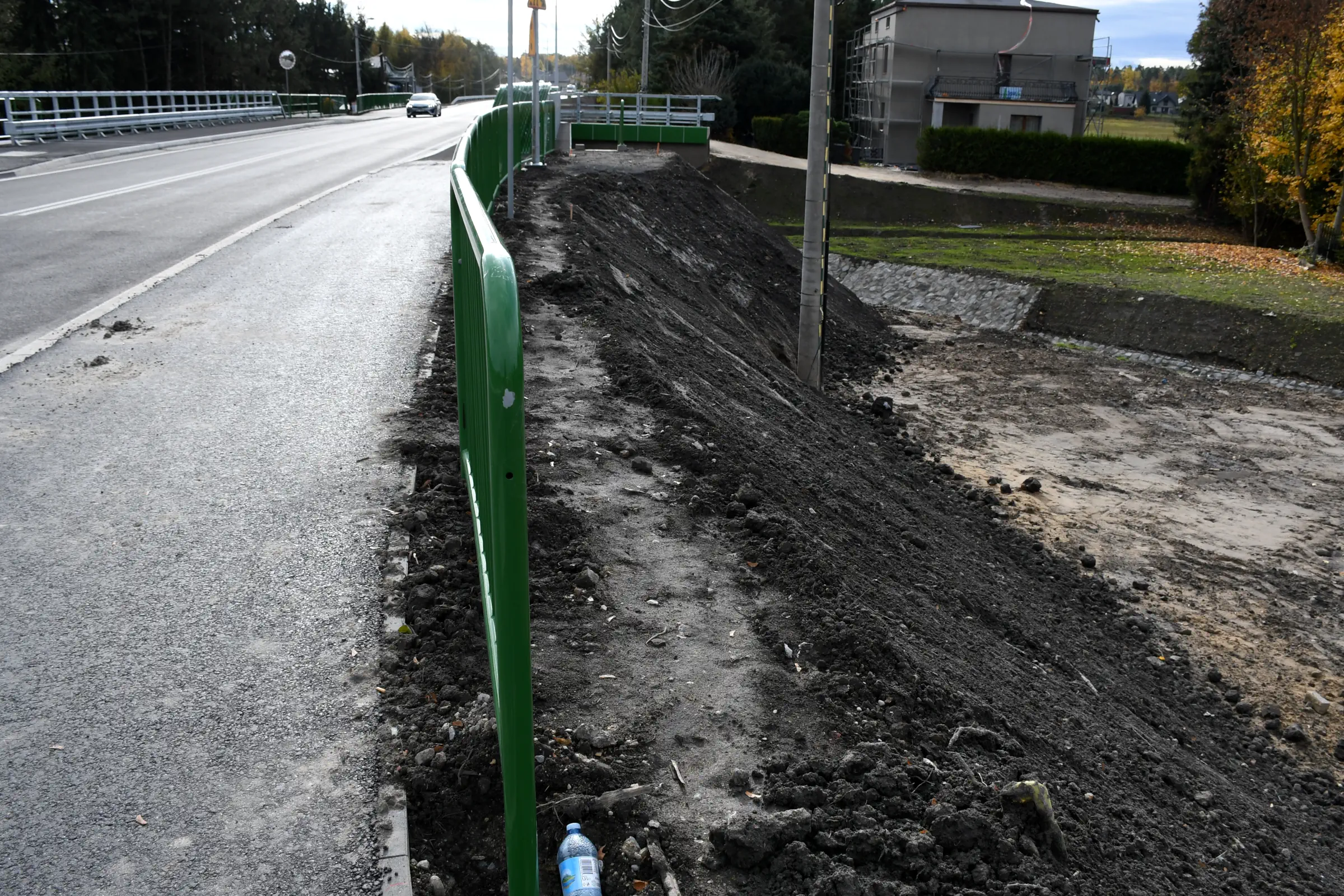 Niedziela, 5 październikaUformowano koryto rzeki w miejscu po rozebranej drodze objazdowejPozostałość po asfaltowaniuWidok na most od strony zachodniejJeszcze kilka miesięcy temu w tym miejscu był zjazd na drogę objazdowąNiedziela, 26 październikaZabezpieczono wylot kanalizacjiSkarpę uformowano i obsiano trawąWidok na most od strony wschodniejBariery energochłonne wzdłuż wschodniej strony jezdniSkarpa i poboczeMagazyn barierek drogowychNa jezdni wykonano linie osioweKażdy komplet zawiera 18 sztuk