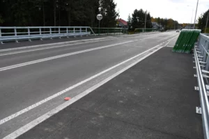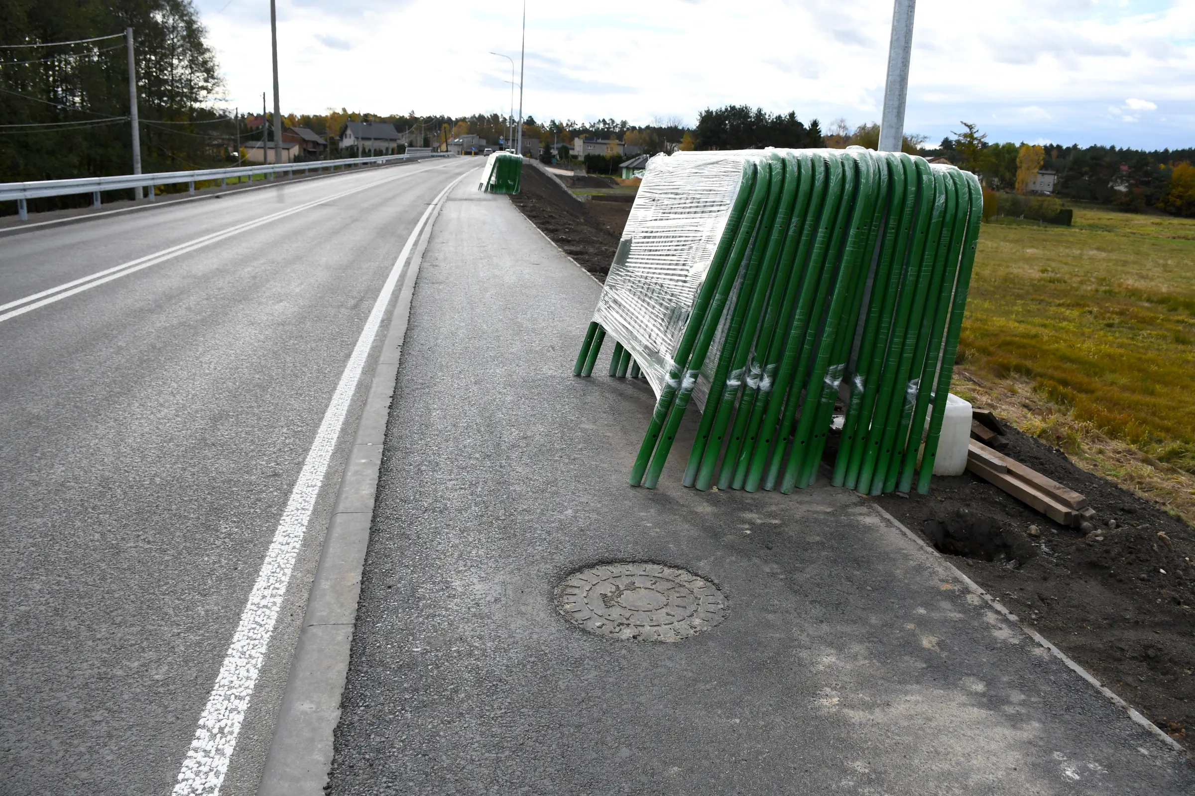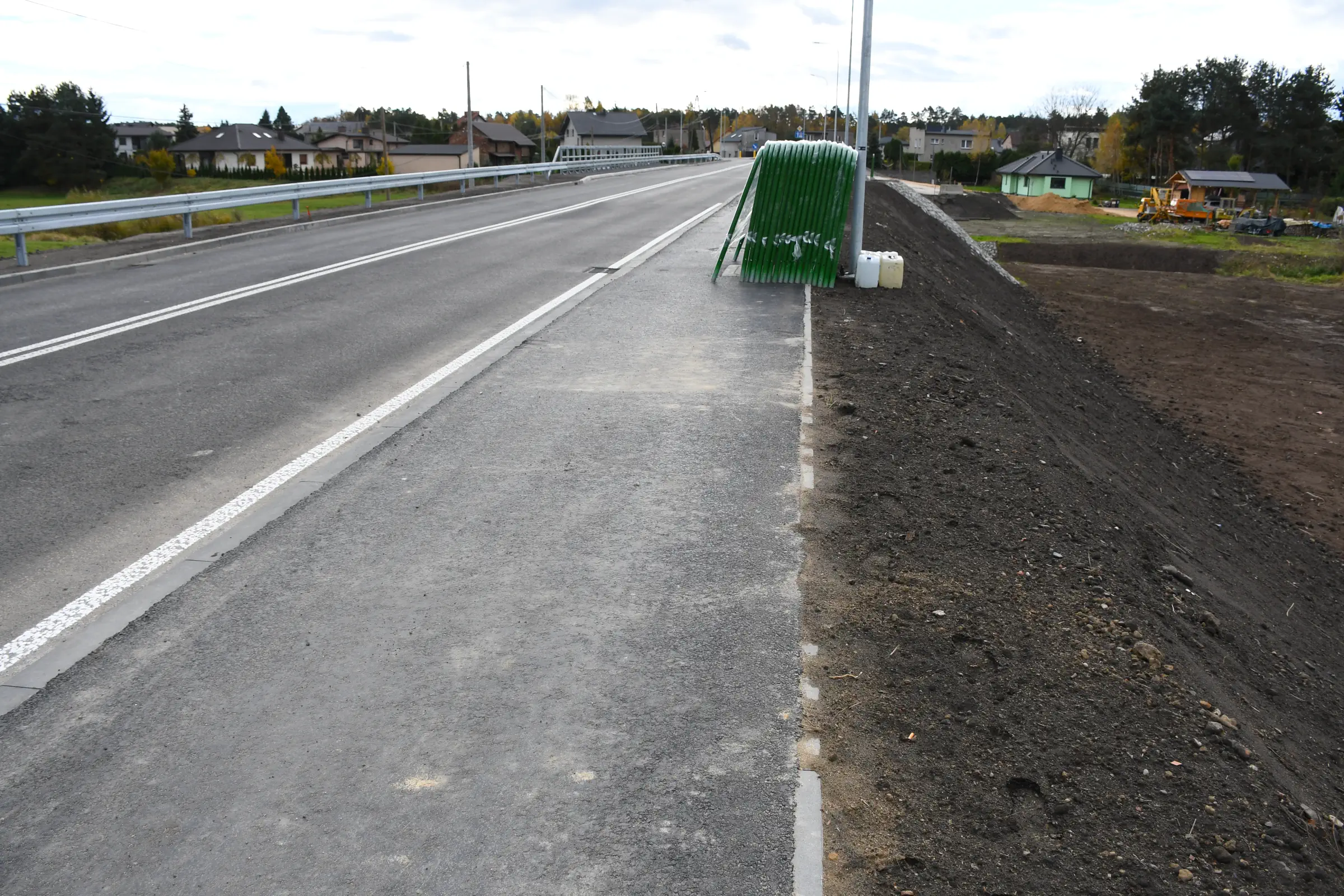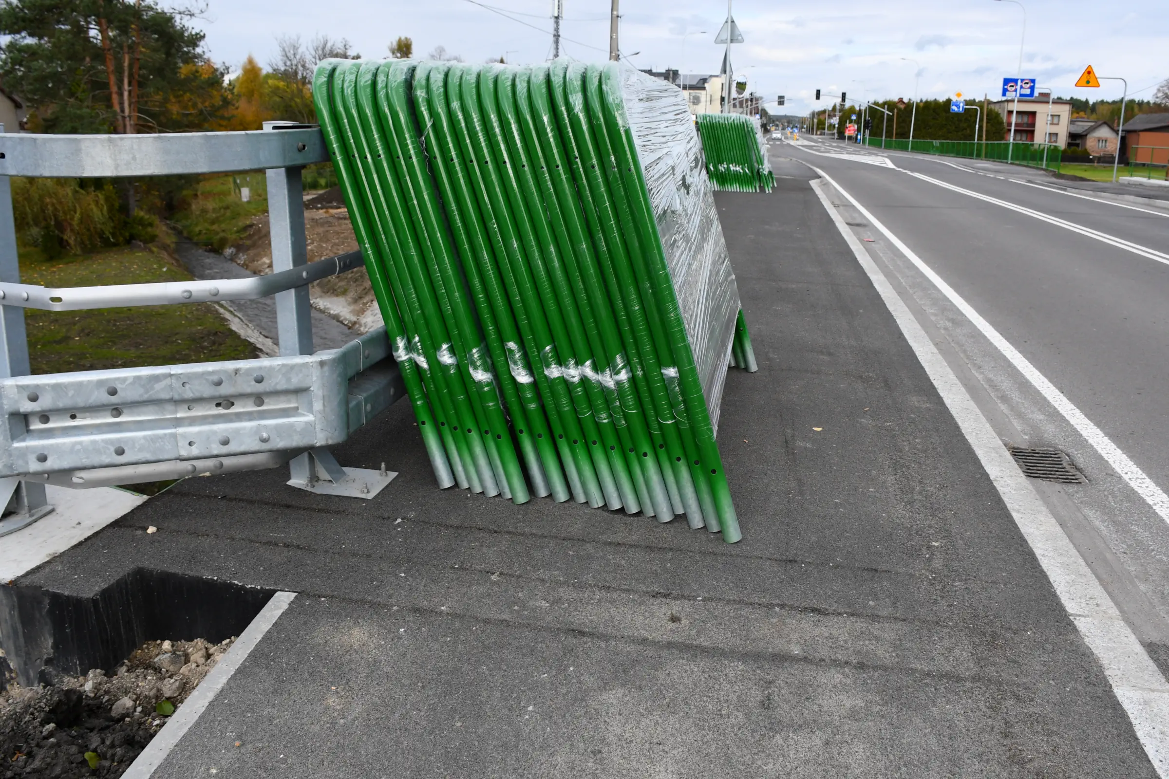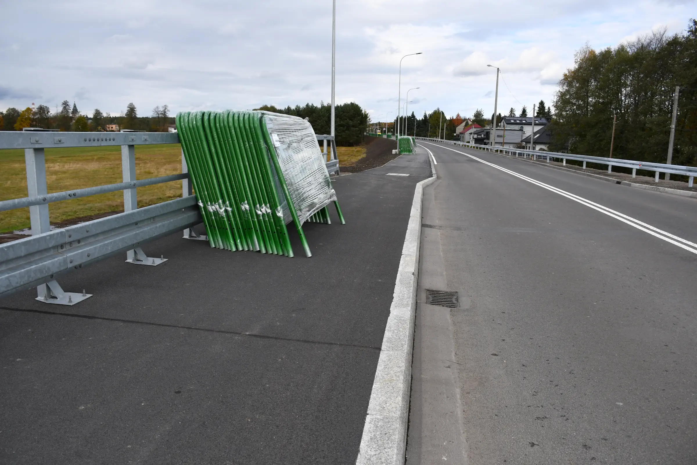 Niedziela, 5 październikaUformowano koryto rzeki w miejscu po rozebranej drodze objazdowejPozostałość po asfaltowaniuWidok na most od strony zachodniejJeszcze kilka miesięcy temu w tym miejscu był zjazd na drogę objazdowąNiedziela, 26 październikaZabezpieczono wylot kanalizacjiSkarpę uformowano i obsiano trawąWidok na most od strony wschodniejBariery energochłonne wzdłuż wschodniej strony jezdniSkarpa i poboczeMagazyn barierek drogowychNa jezdni wykonano linie osioweKażdy komplet zawiera 18 sztuk