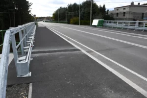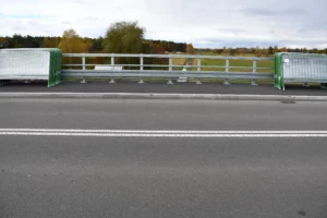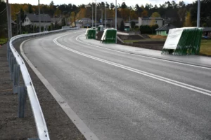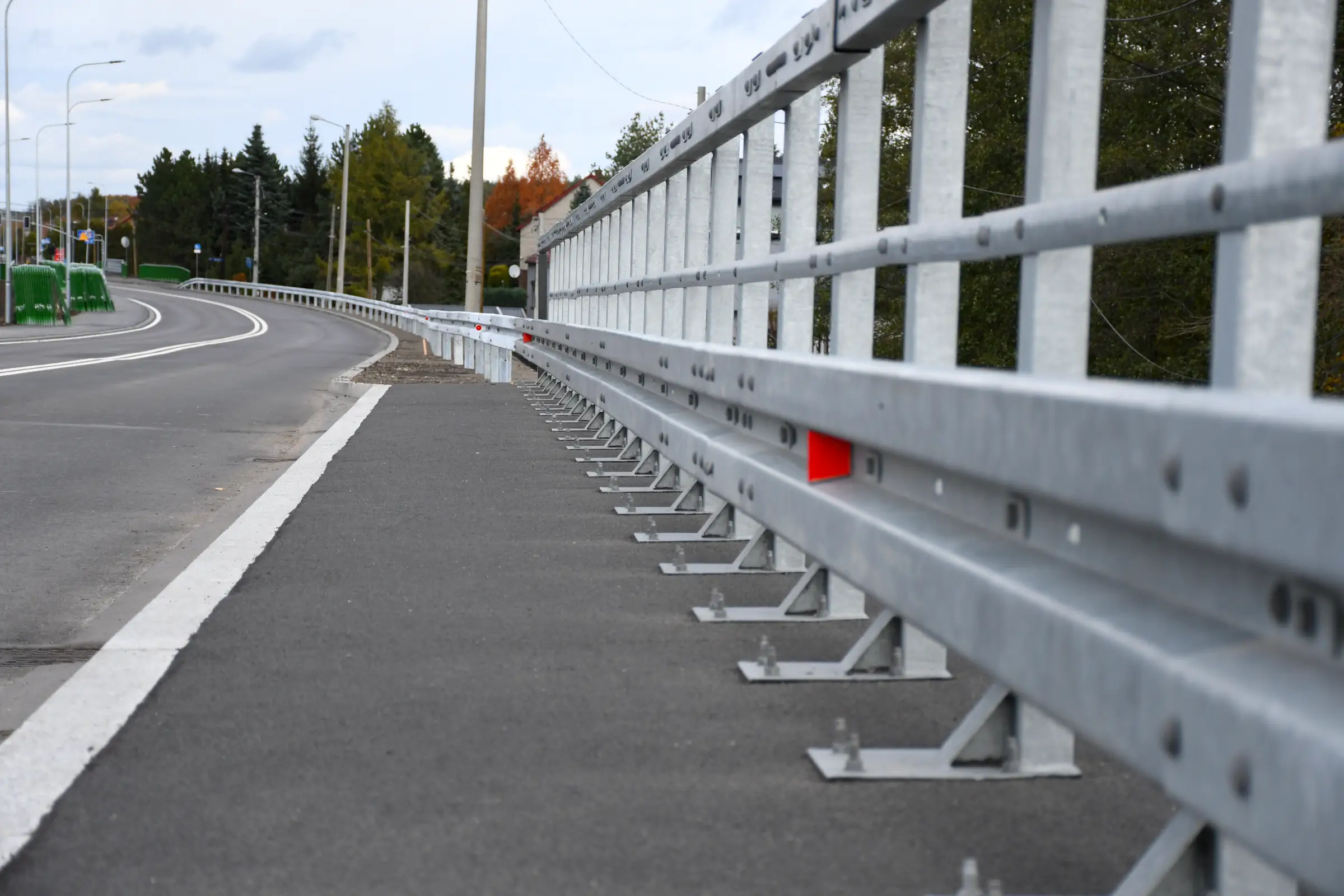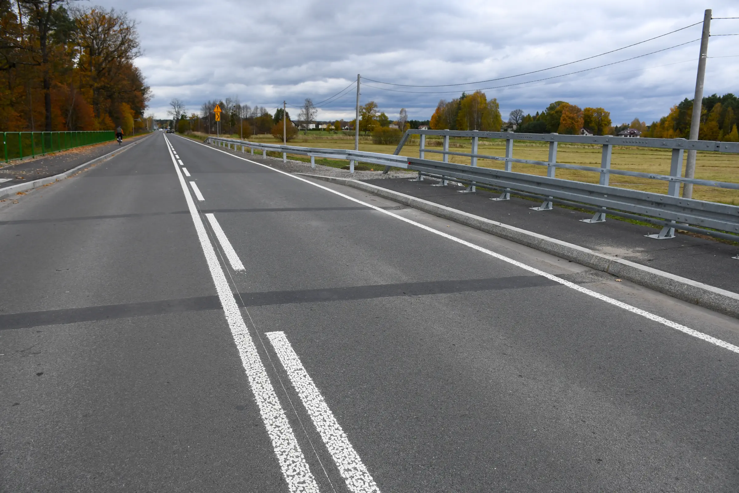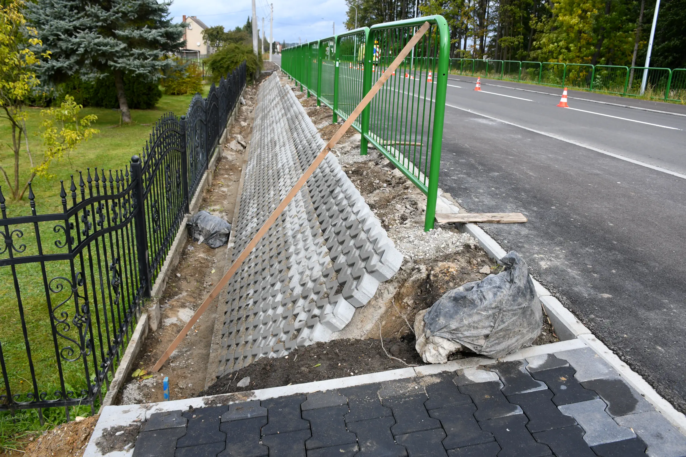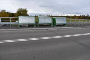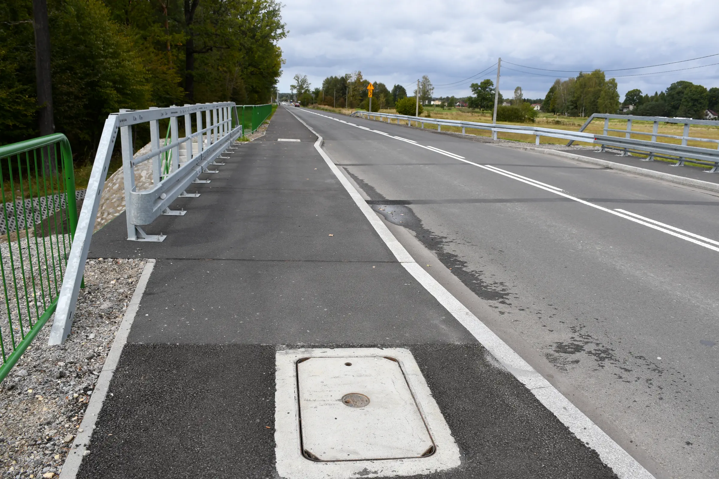 Niedziela, 5 październikaUformowano koryto rzeki w miejscu po rozebranej drodze objazdowejPozostałość po asfaltowaniuWidok na most od strony zachodniejJeszcze kilka miesięcy temu w tym miejscu był zjazd na drogę objazdowąNiedziela, 26 październikaZabezpieczono wylot kanalizacjiSkarpę uformowano i obsiano trawąWidok na most od strony wschodniejBariery energochłonne wzdłuż wschodniej strony jezdniSkarpa i poboczeMagazyn barierek drogowychNa jezdni wykonano linie osioweKażdy komplet zawiera 18 sztuk