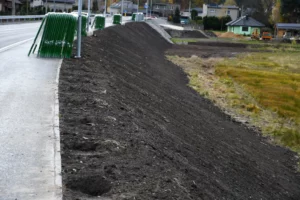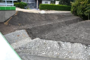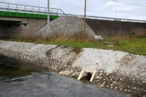 2. Ostatnie działania porządkowe przeprowadzono również wokół mostu nad rzeką Gostynką (obiekt M2). Obudowano ujścia kanalizacji deszczowej umieszczone w korycie po stronie wschodniej mostu z wykorzystaniem prefabrykowanych elementów i zakończono rozbiórkę nasypu po drodze objazdowej po stronie zachodniej. W połowie miesiąca przy okazji prac przy odcinku obejmującym nasyp w kierunku centrum przy moście zainstalowano słupy oświetlenia ulicznego wraz z oprawami.