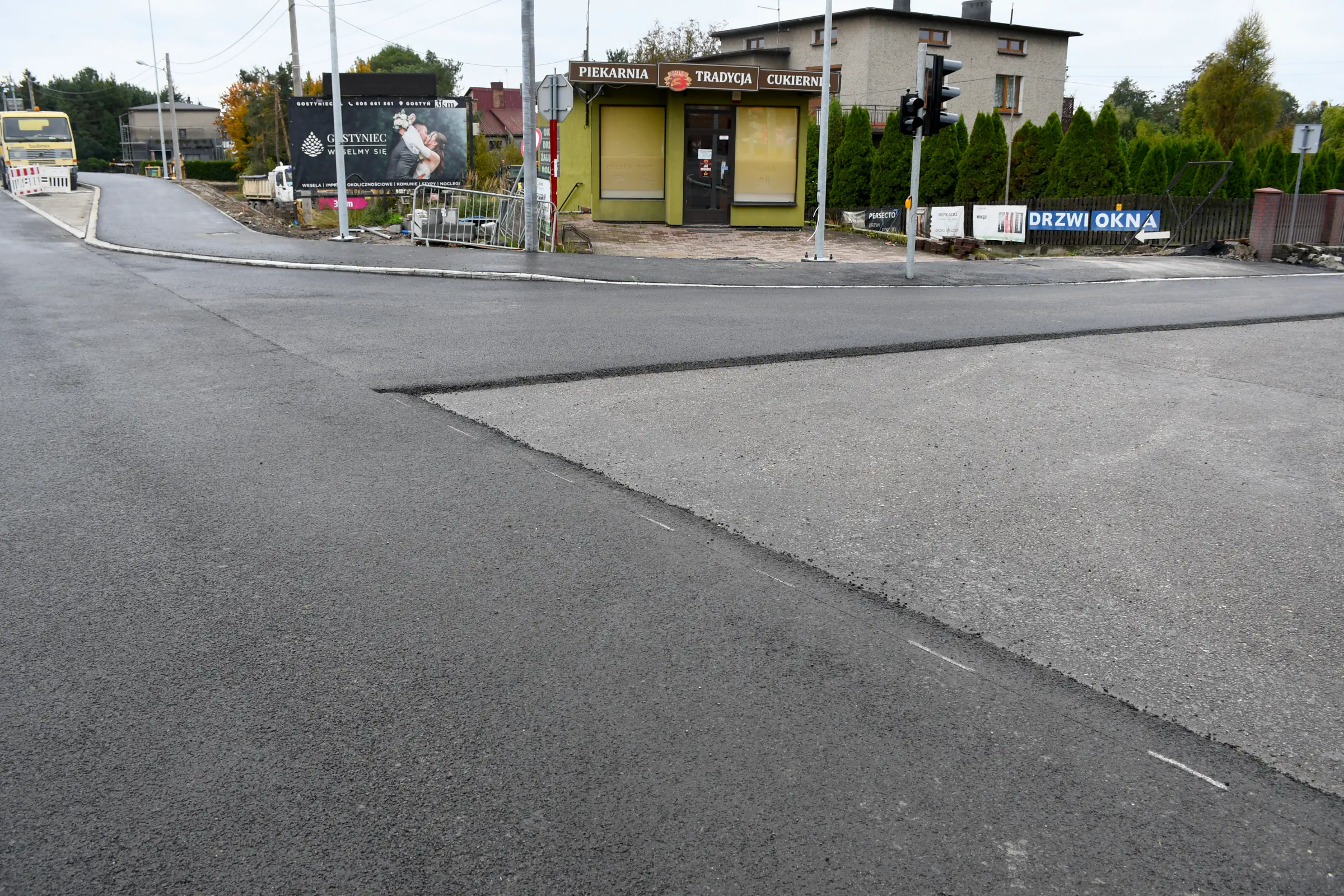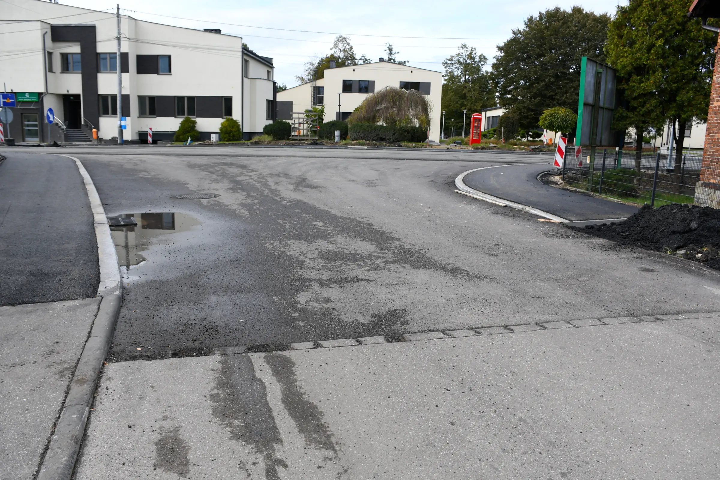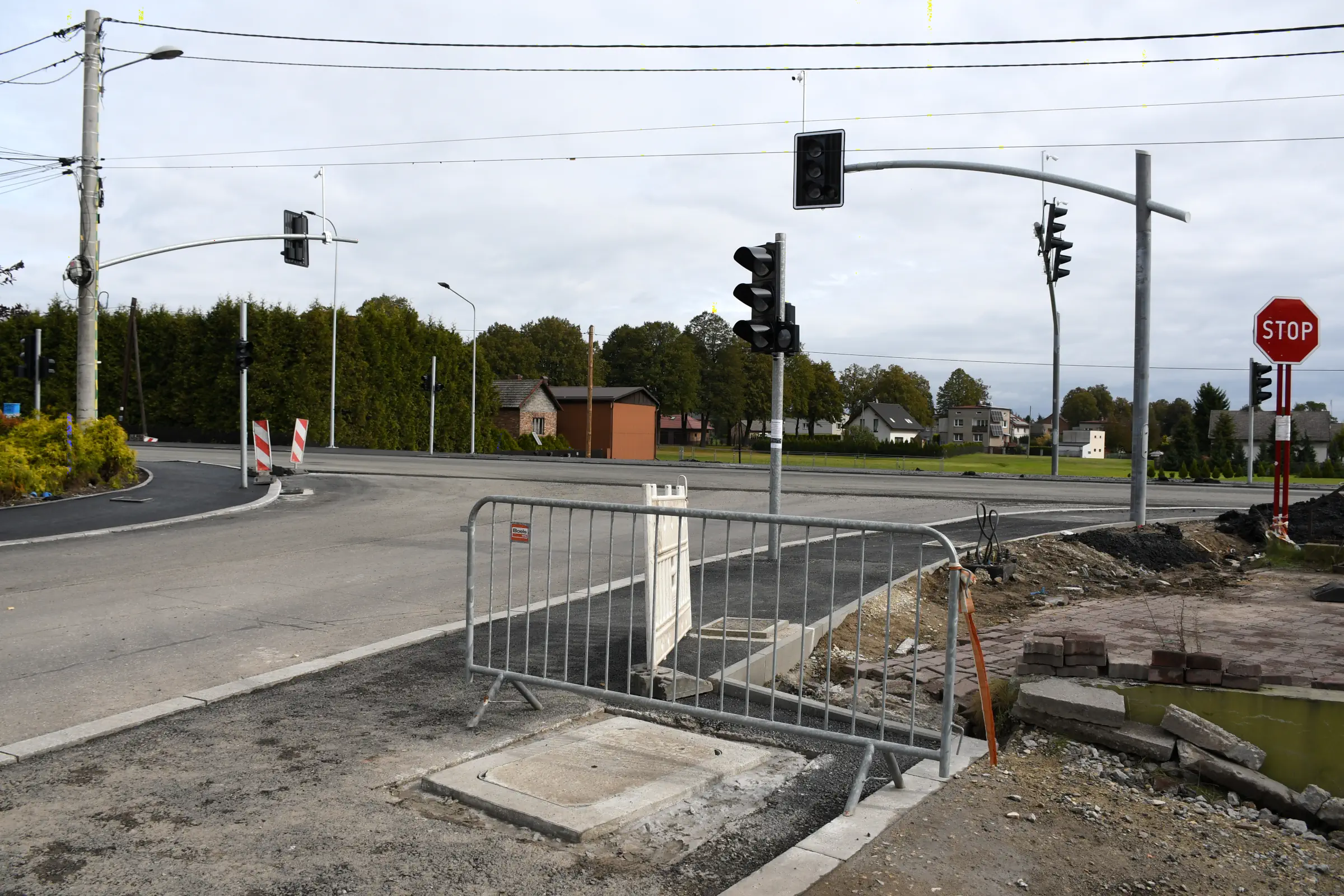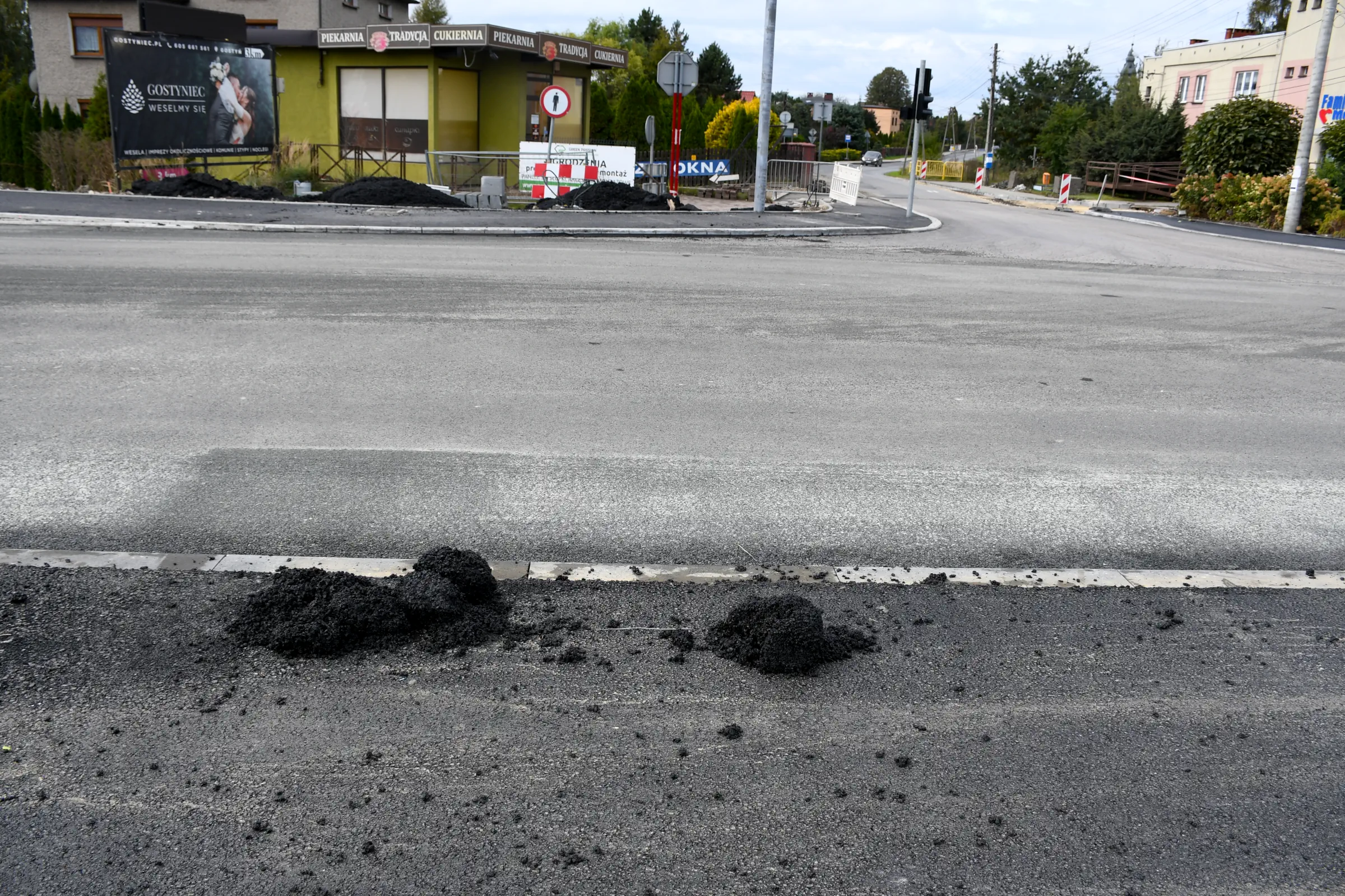 6. Sporo zmieniło się też przy skrzyżowaniu ul. Pszczyńskiej z ul. Rybnicką i ul. Tyską tuż obok gostyńskich budynków użyteczności publicznej. Na przełomie września (30 września) i października przeprowadzono montaż sygnalizacji świetlnej w centrum, która po zakończeniu prac zaczęła działać w trybie ostrzegawczym (migające światło żółte), informując kierowców o zachowaniu szczególnej ostrożności do czasu pełnego uruchomienia w listopadzie. W kolejnych dniach, 3-4 października (piątek i sobota), ułożono warstwę ścieralną jezdni głównej, a w ciągu następnego tygodnia dokończono prace przy nawierzchni ciągu pieszo-rowerowego po stronie biblioteki. Poza tym wykonano warstwę ścieralną zjazdów na drogi publiczne i wjazdów na parkingi, przy czym zjazd na ul. Rybnicką zrealizowano w trybie wahadłowym, bez zamykania tej drogi na cały dzień. Pod koniec miesiąca wykonano oznakowanie pionowe i poziome odcinka z uwzględnieniem krótkiego fragmentu ul. Rybnickiej przed ośrodkiem zdrowia, gdzie wyznaczono linię przystankową dla linii autobusowych M12 i 294 jadących w kierunku szkoły. W międzyczasie zbudowano schody do stacji redukcyjno-pomiarowej gazu i uregulowano wysokość istniejących w centrum chodników z kostki brukowej.