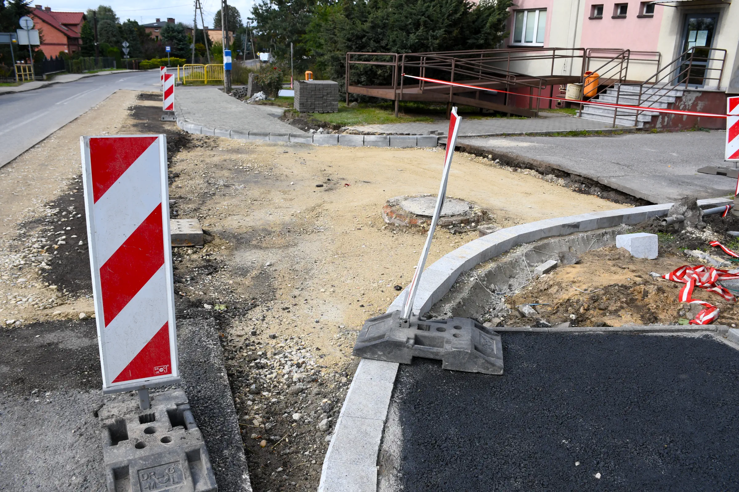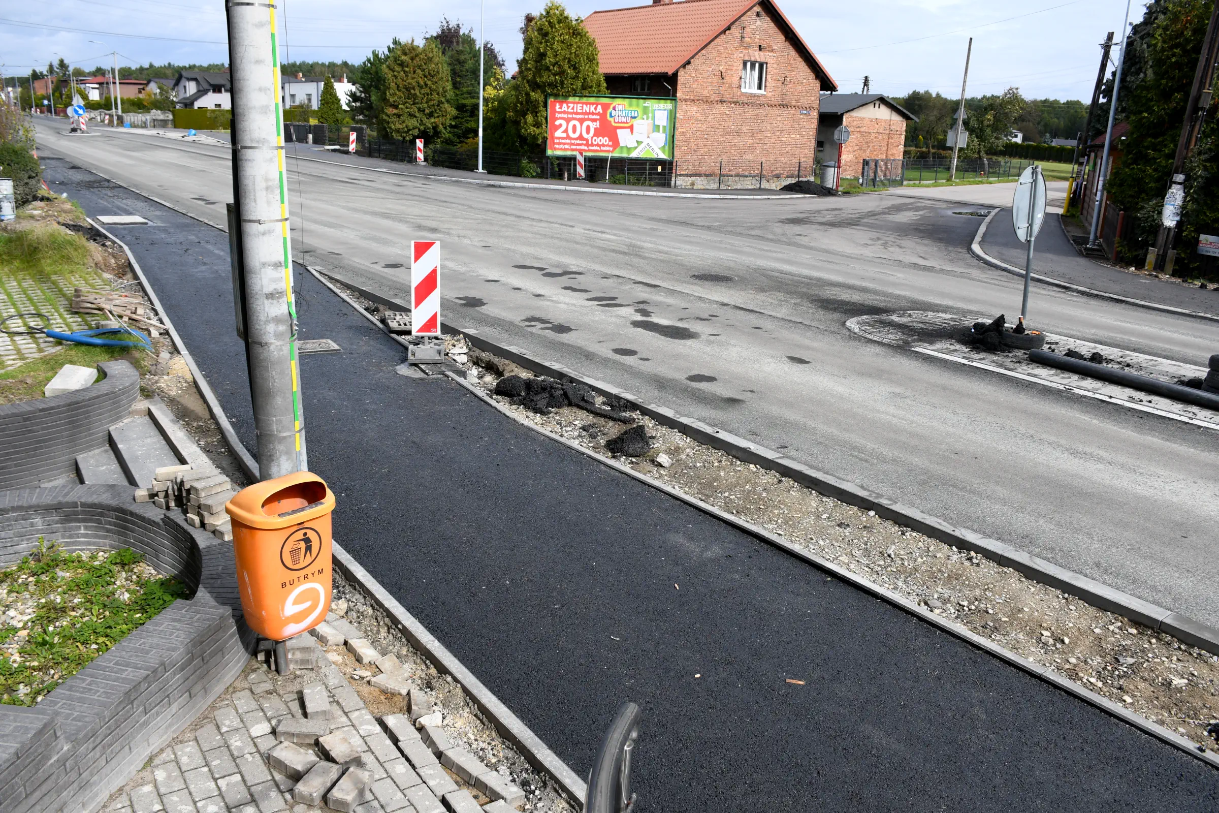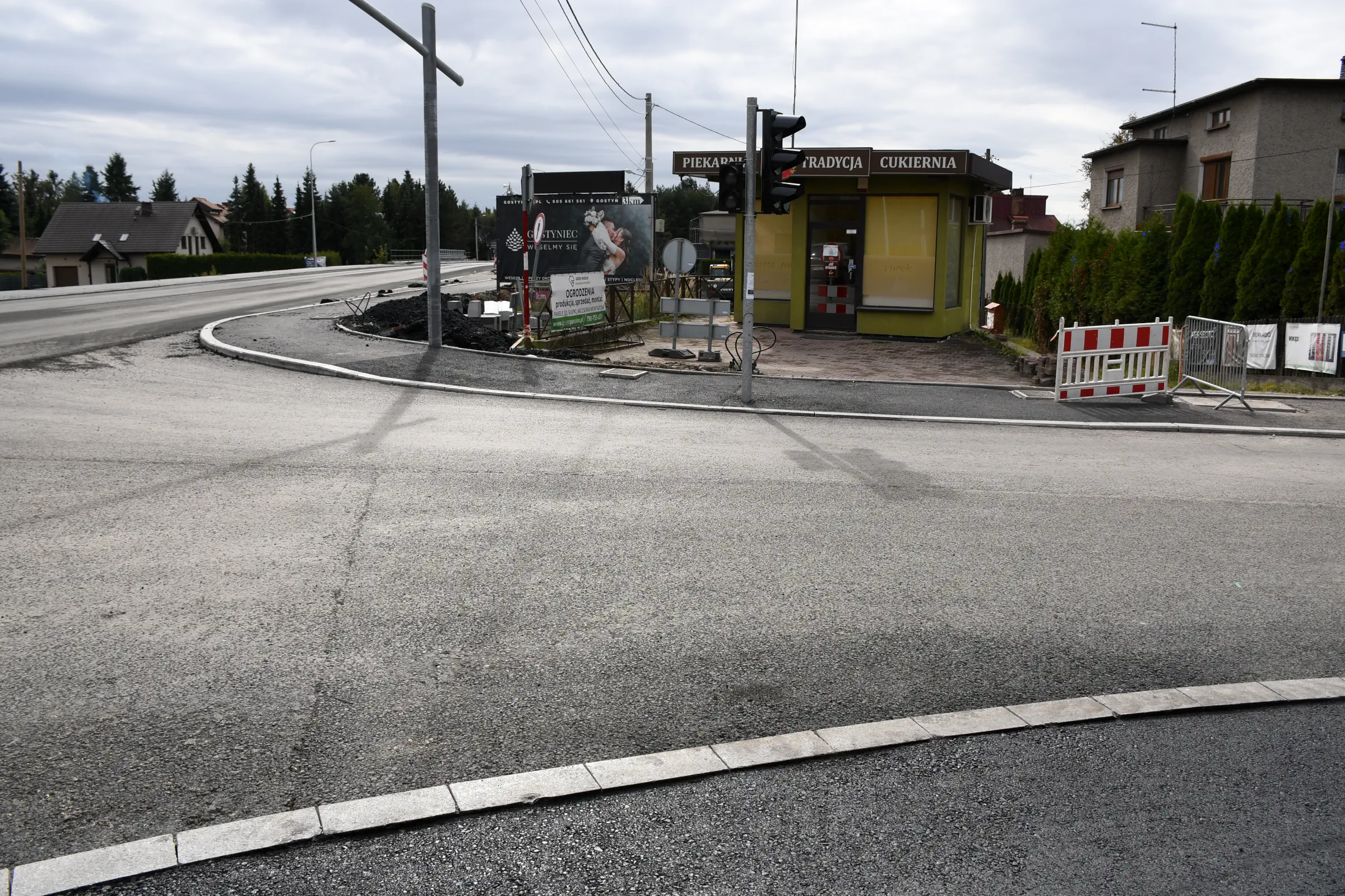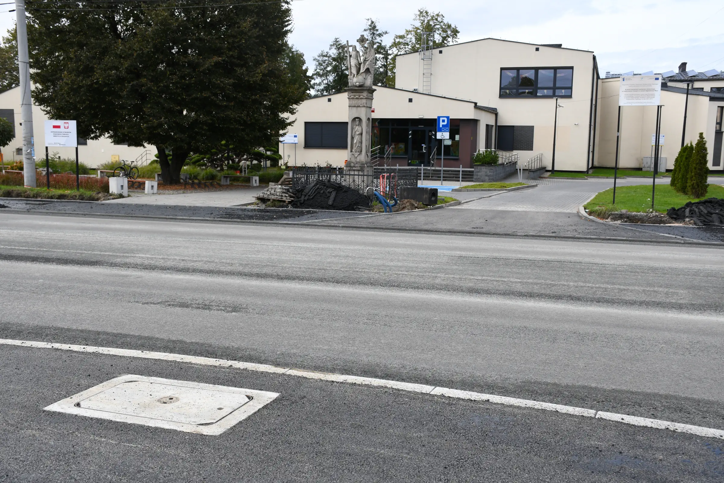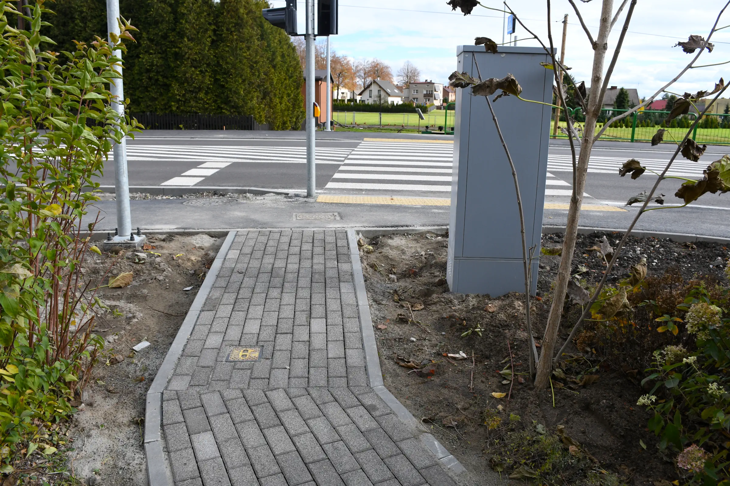 6. Sporo zmieniło się też przy skrzyżowaniu ul. Pszczyńskiej z ul. Rybnicką i ul. Tyską tuż obok gostyńskich budynków użyteczności publicznej. Na przełomie września (30 września) i października przeprowadzono montaż sygnalizacji świetlnej w centrum, która po zakończeniu prac zaczęła działać w trybie ostrzegawczym (migające światło żółte), informując kierowców o zachowaniu szczególnej ostrożności do czasu pełnego uruchomienia w listopadzie. W kolejnych dniach, 3-4 października (piątek i sobota), ułożono warstwę ścieralną jezdni głównej, a w ciągu następnego tygodnia dokończono prace przy nawierzchni ciągu pieszo-rowerowego po stronie biblioteki. Poza tym wykonano warstwę ścieralną zjazdów na drogi publiczne i wjazdów na parkingi, przy czym zjazd na ul. Rybnicką zrealizowano w trybie wahadłowym, bez zamykania tej drogi na cały dzień. Pod koniec miesiąca wykonano oznakowanie pionowe i poziome odcinka z uwzględnieniem krótkiego fragmentu ul. Rybnickiej przed ośrodkiem zdrowia, gdzie wyznaczono linię przystankową dla linii autobusowych M12 i 294 jadących w kierunku szkoły. W międzyczasie zbudowano schody do stacji redukcyjno-pomiarowej gazu i uregulowano wysokość istniejących w centrum chodników z kostki brukowej.