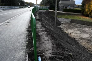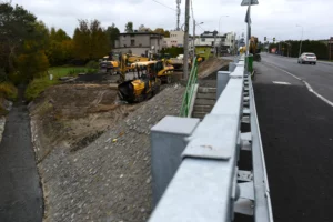 1. W obrębie mostu nad ciekiem „S” – Młynówka (obiekt M1) zakończono prace przy umacnianiu koryta i profilowaniu nasypów. Przy obu krańcach ustroju nośnego w połowie miesiąca zainstalowano słupy oświetlenia ulicznego wraz z oprawami.