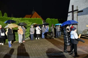 Uczestnicy procesji Drogi Krzyżowej zebrali się przed kościołem pw. Podwyższenia Krzyża Św. o godz. 19.00. Wiernych z obu parafii, przybyłych mimo przelotnego deszczu i odczuwalnego chłodu, przywitał ks. prob. Henryk Nowara, zapraszając do wspólnej modlitwy, refleksji i szukania duchowego umocnienia.