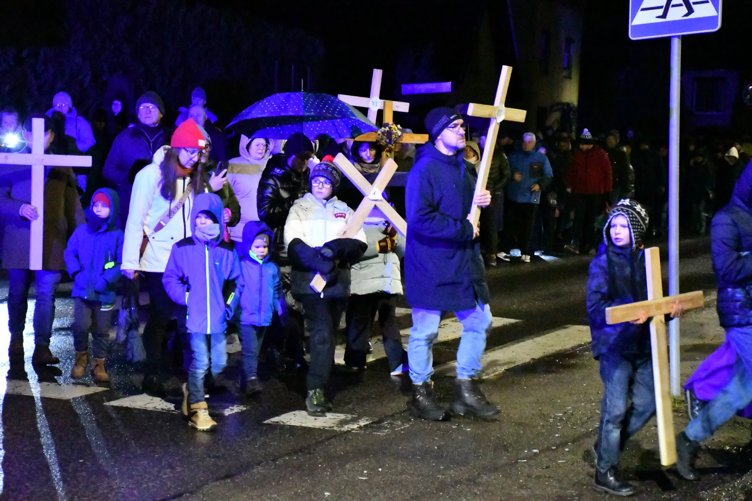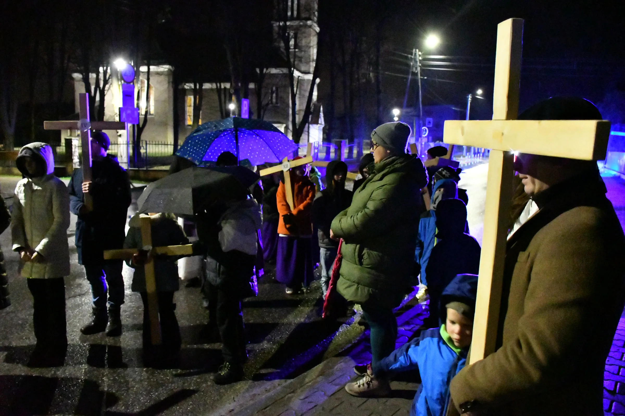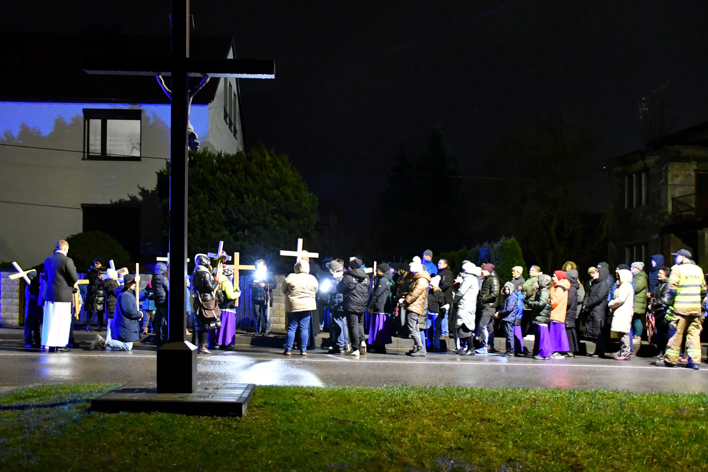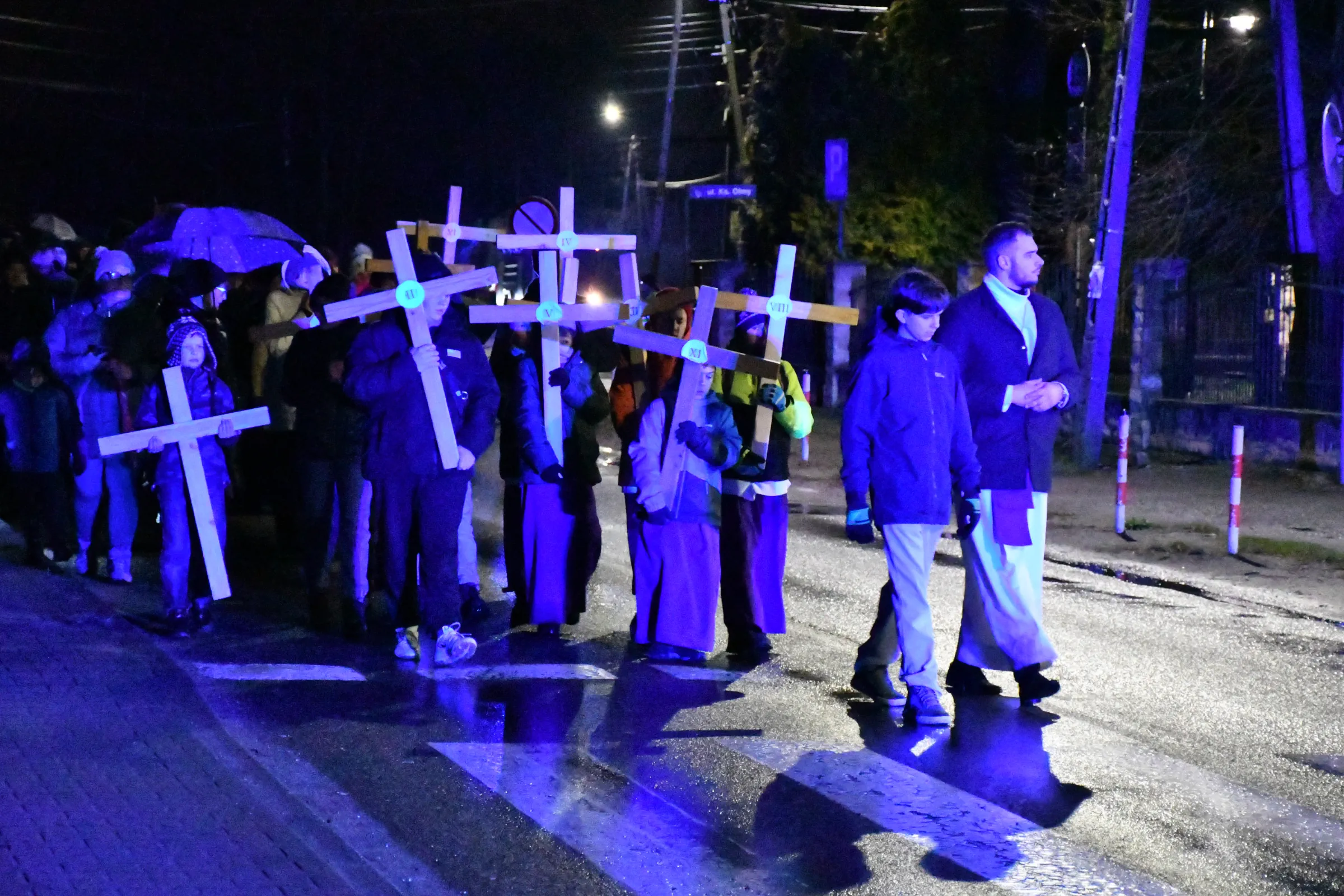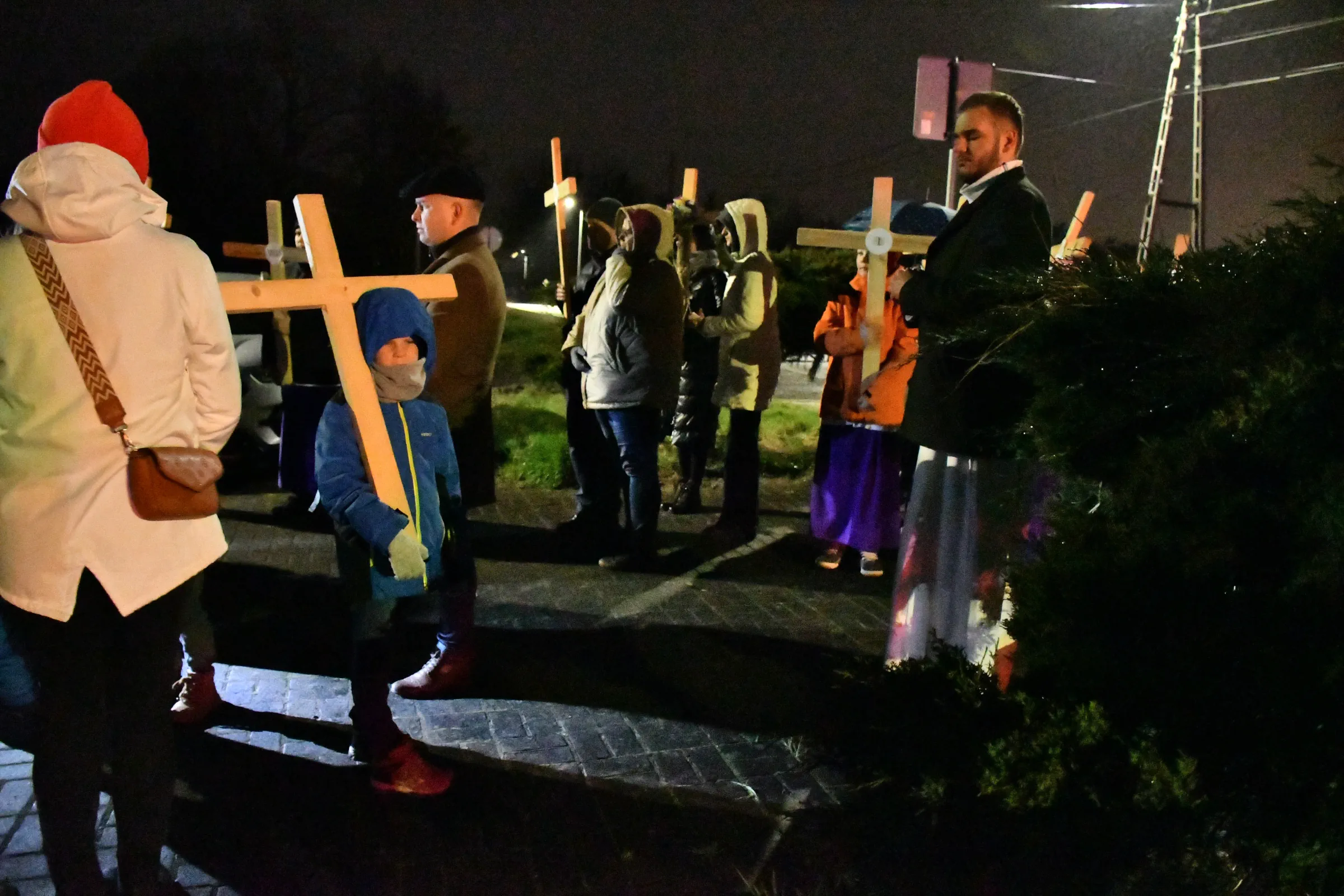 Przed wyruszeniem w drogę do czternastu stacji Drogi Krzyżowej część wiernych odebrała przygotowane wcześniej drewniane krzyże – te same, które towarzyszą Gostynianom od pierwszego przemarszu w 2022 roku – a inni, zgodnie z tą samą tradycją, zapalili przyniesione przez siebie świece, głównie ledowe. W tym roku najwięcej krzyży stacyjnych zdecydowało się nieść najmłodsze pokolenie parafian, choć nie zabrakło też nieco starszych wiekiem osób, które czynią to z najwyższą czcią każdego roku.