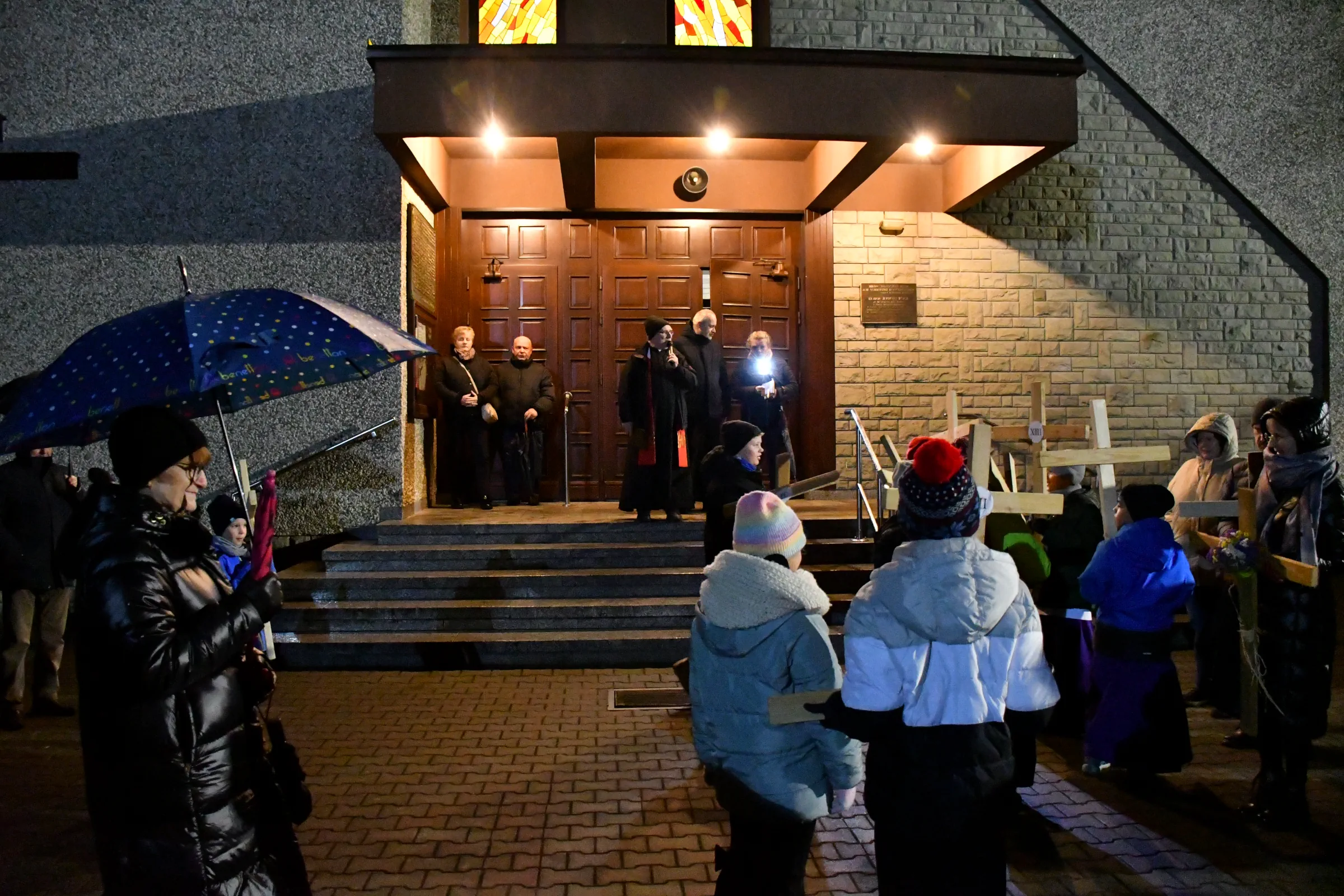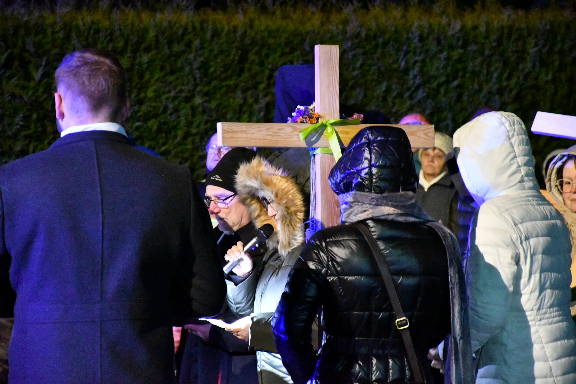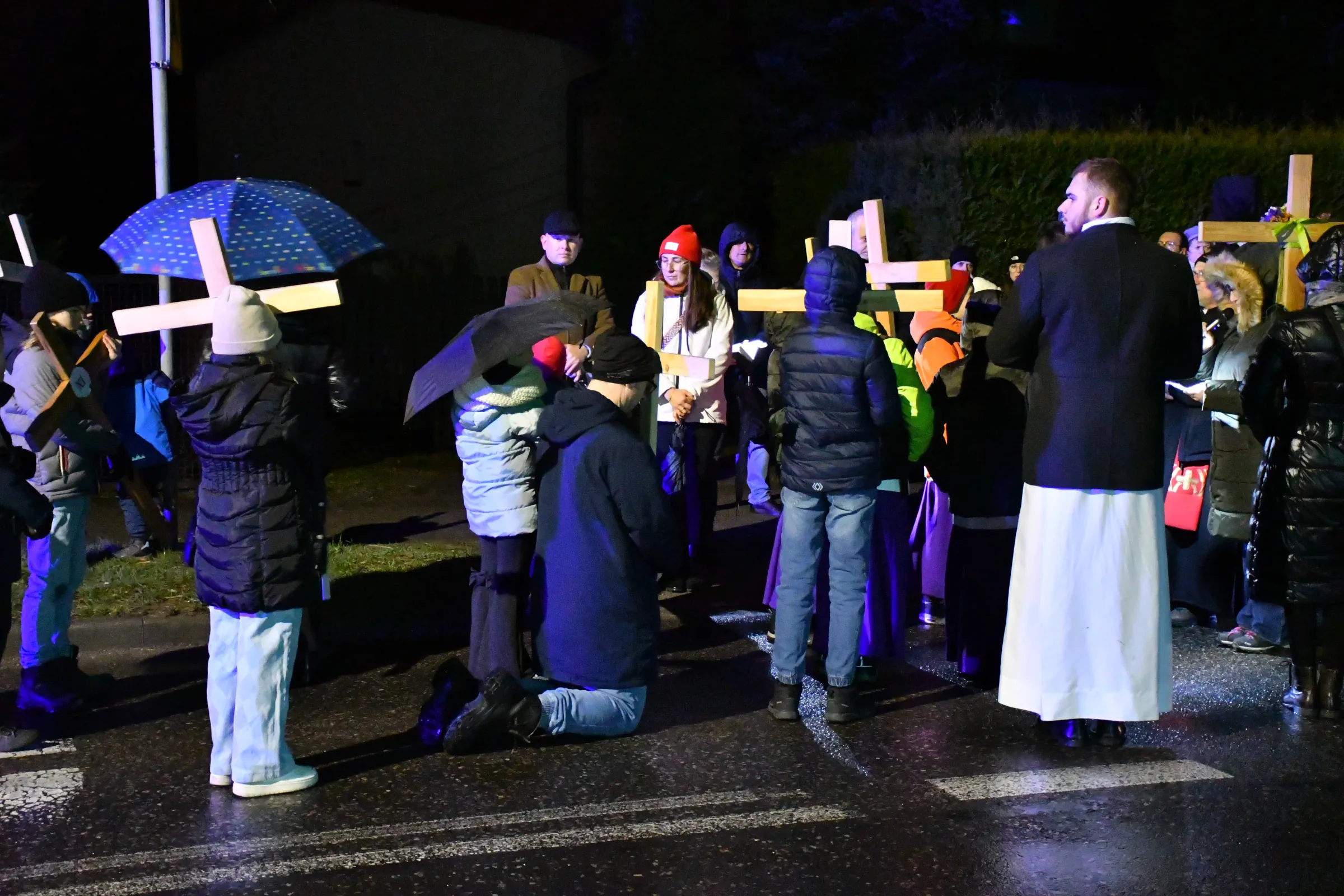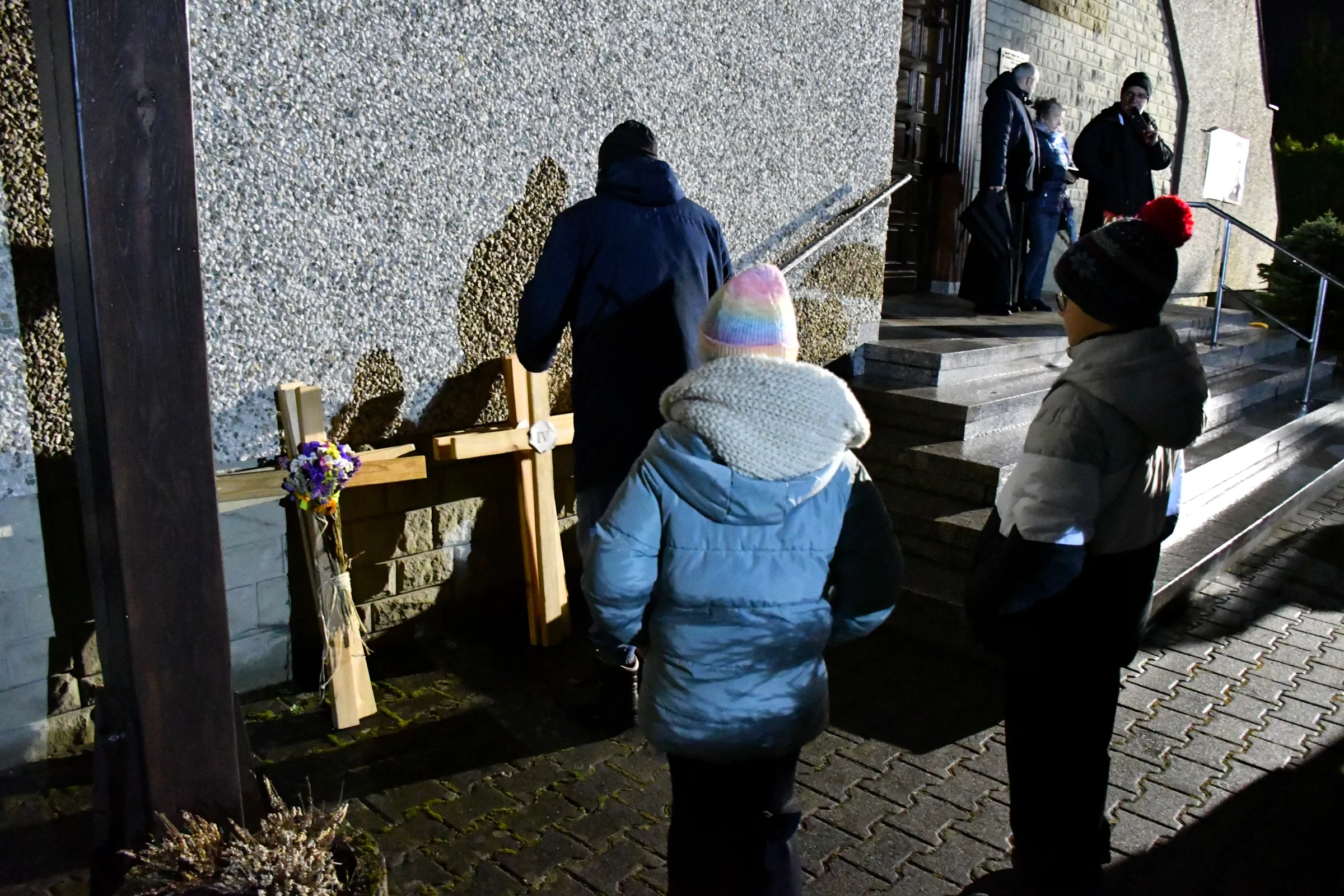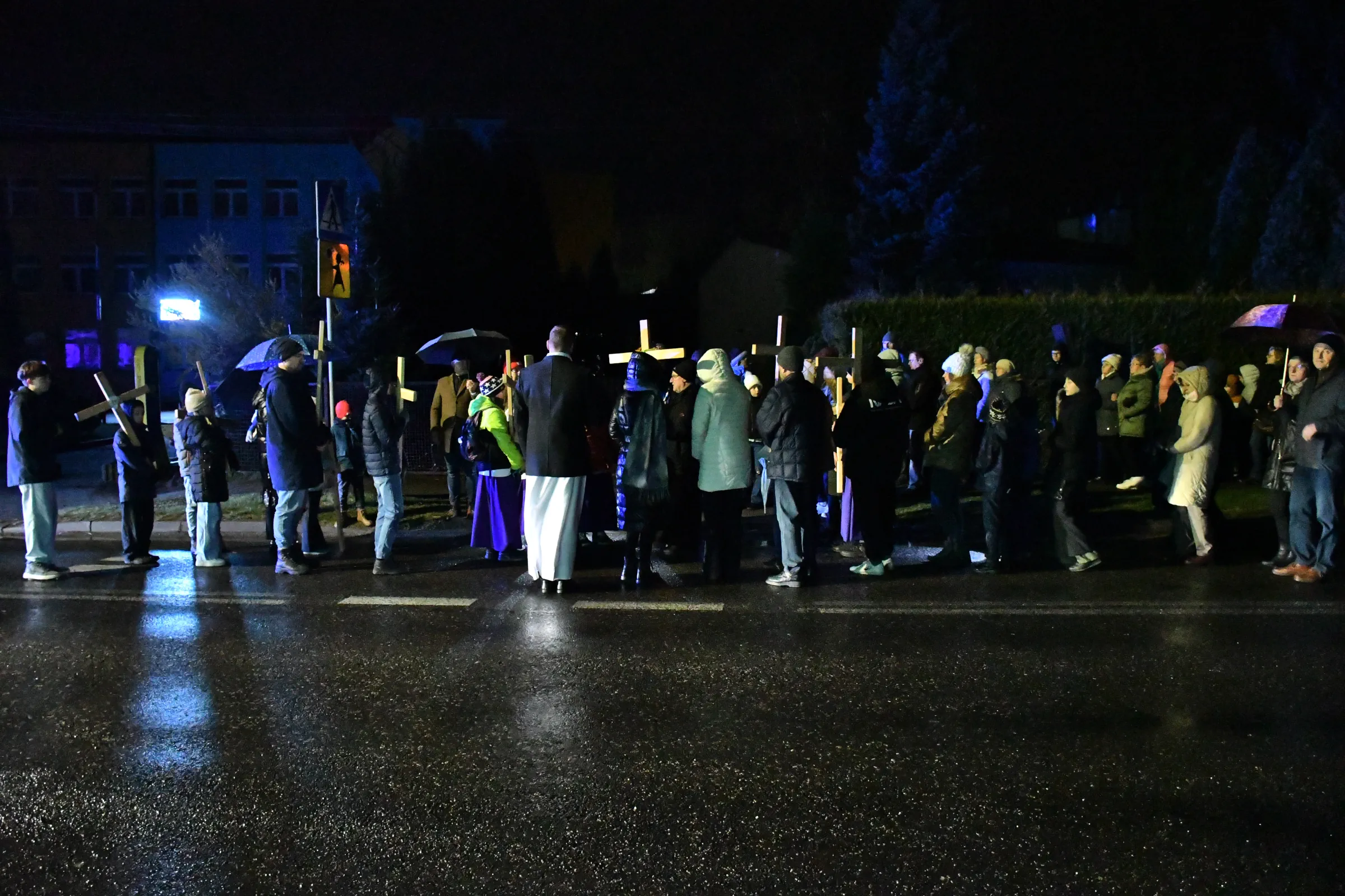 Przed wyruszeniem w drogę do czternastu stacji Drogi Krzyżowej część wiernych odebrała przygotowane wcześniej drewniane krzyże – te same, które towarzyszą Gostynianom od pierwszego przemarszu w 2022 roku – a inni, zgodnie z tą samą tradycją, zapalili przyniesione przez siebie świece, głównie ledowe. W tym roku najwięcej krzyży stacyjnych zdecydowało się nieść najmłodsze pokolenie parafian, choć nie zabrakło też nieco starszych wiekiem osób, które czynią to z najwyższą czcią każdego roku.