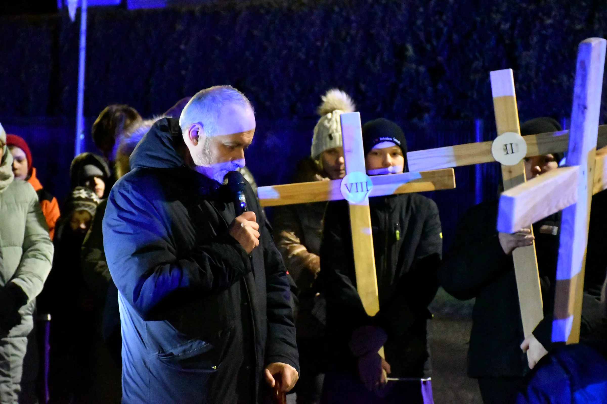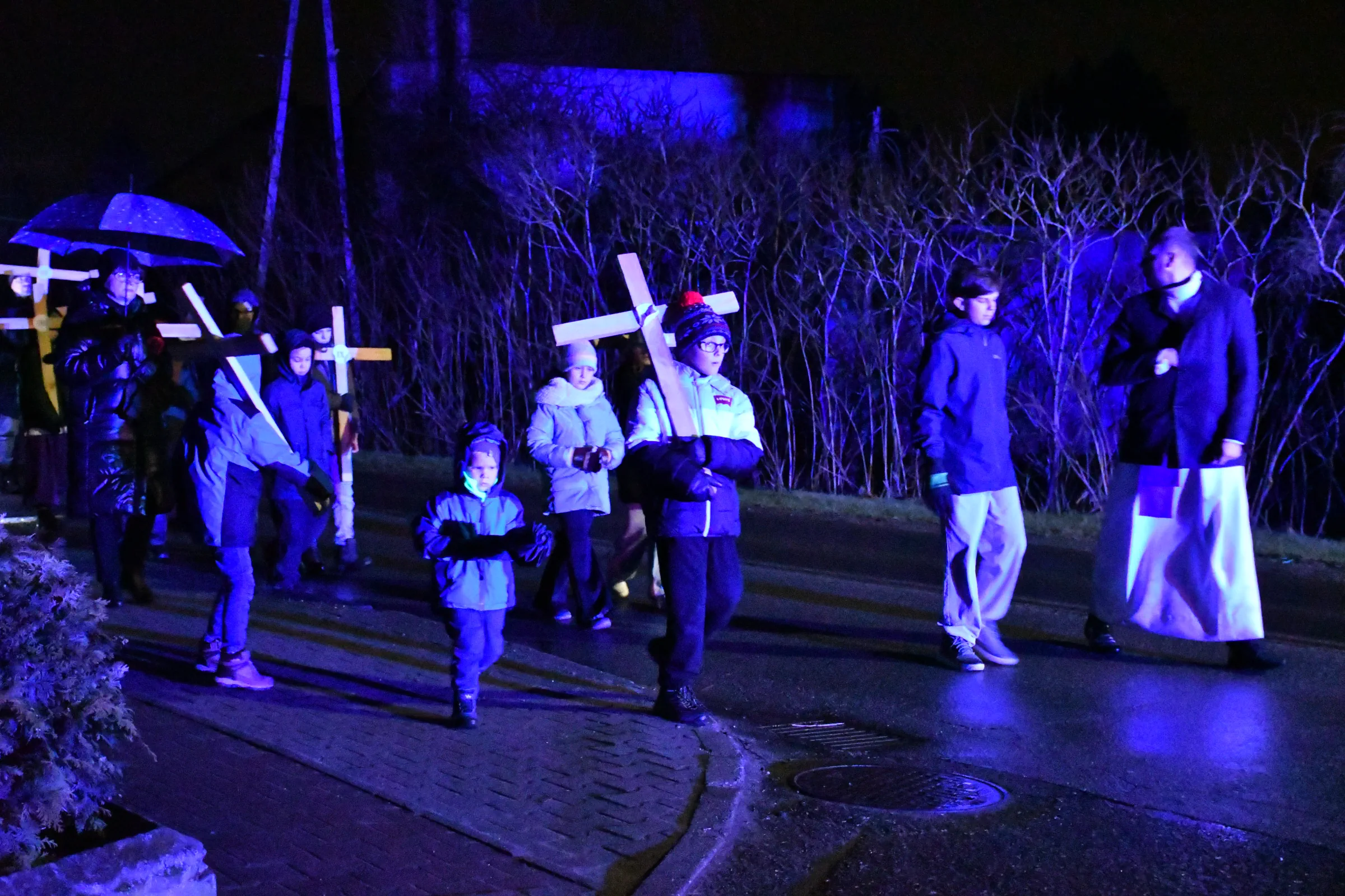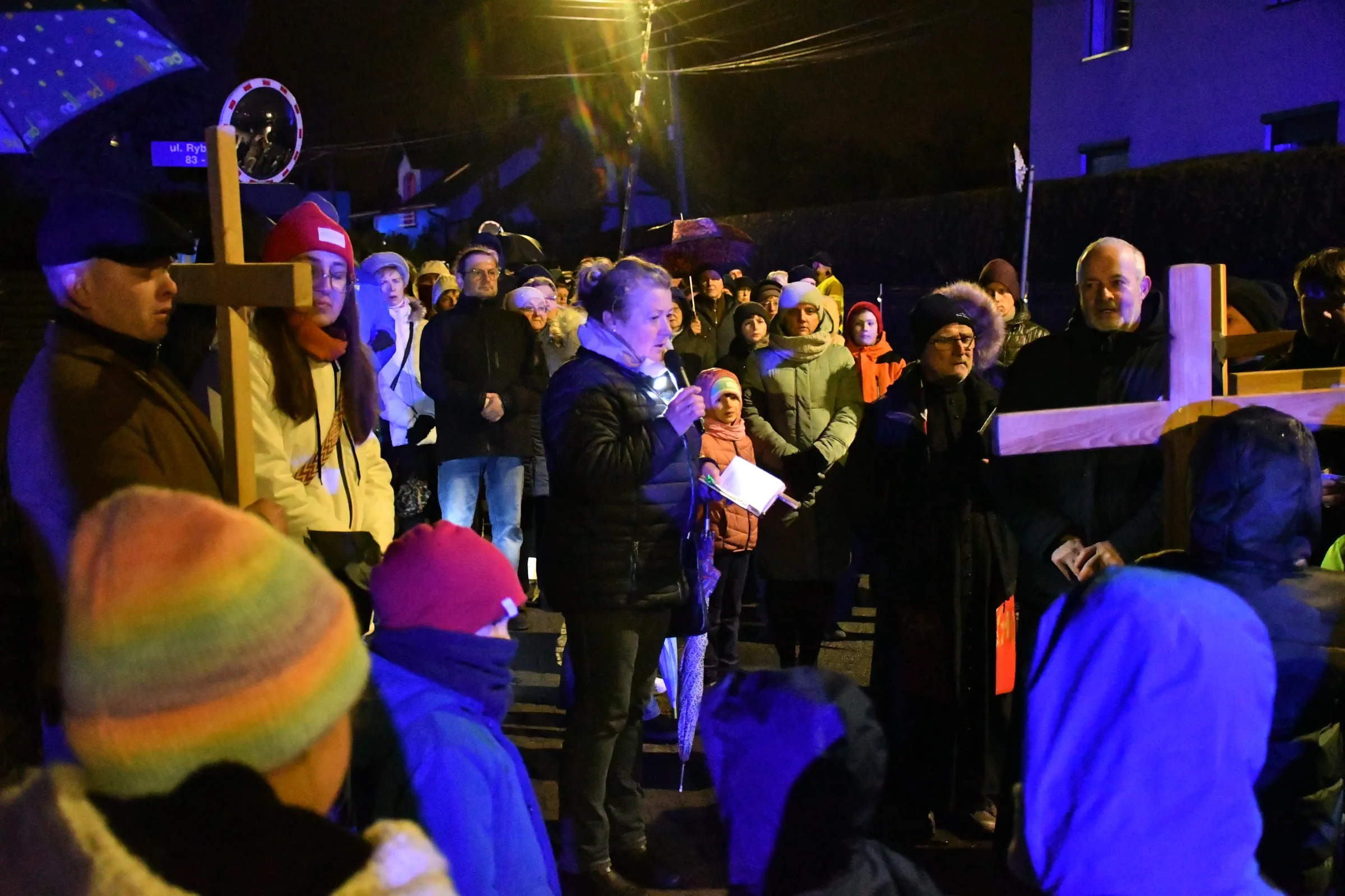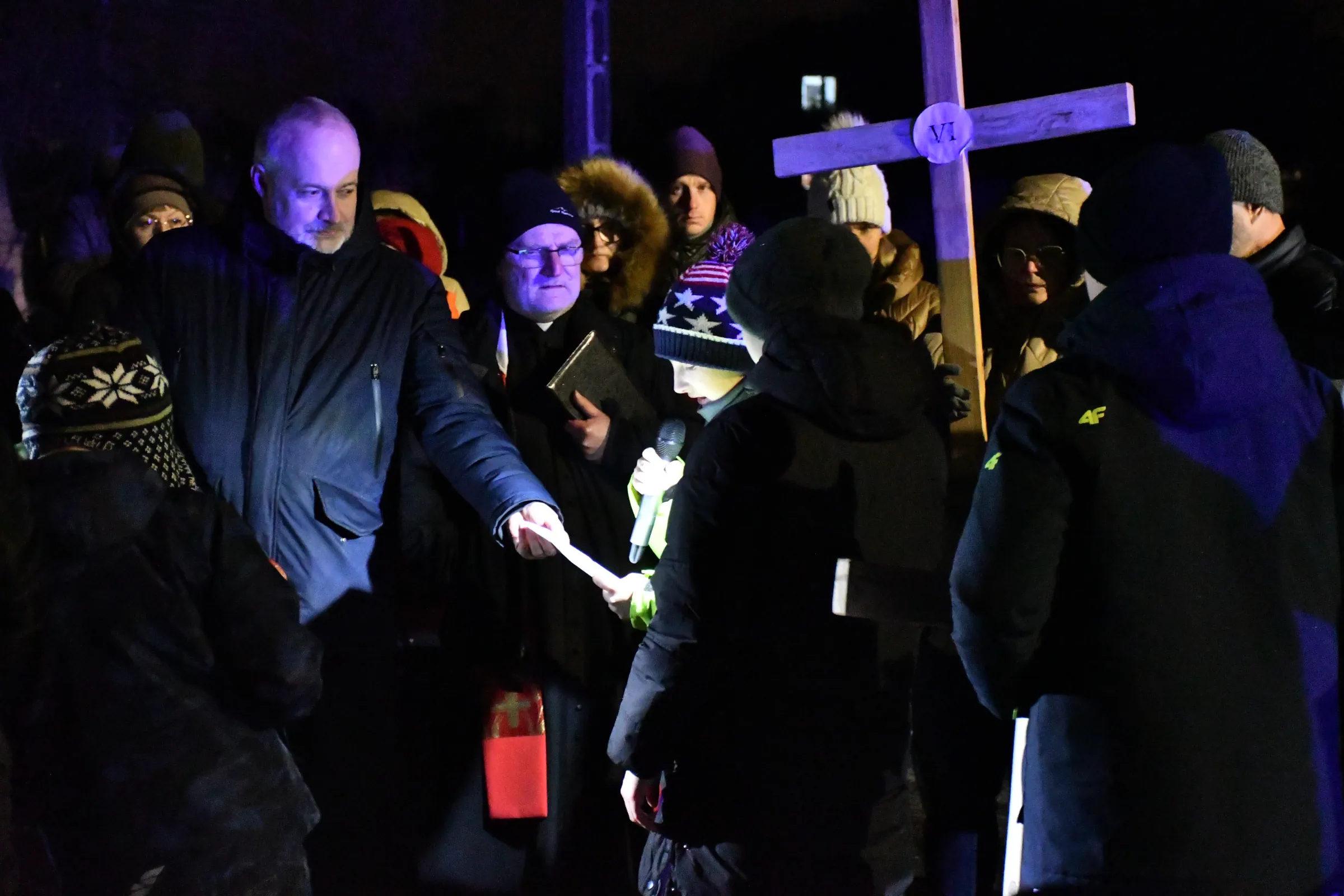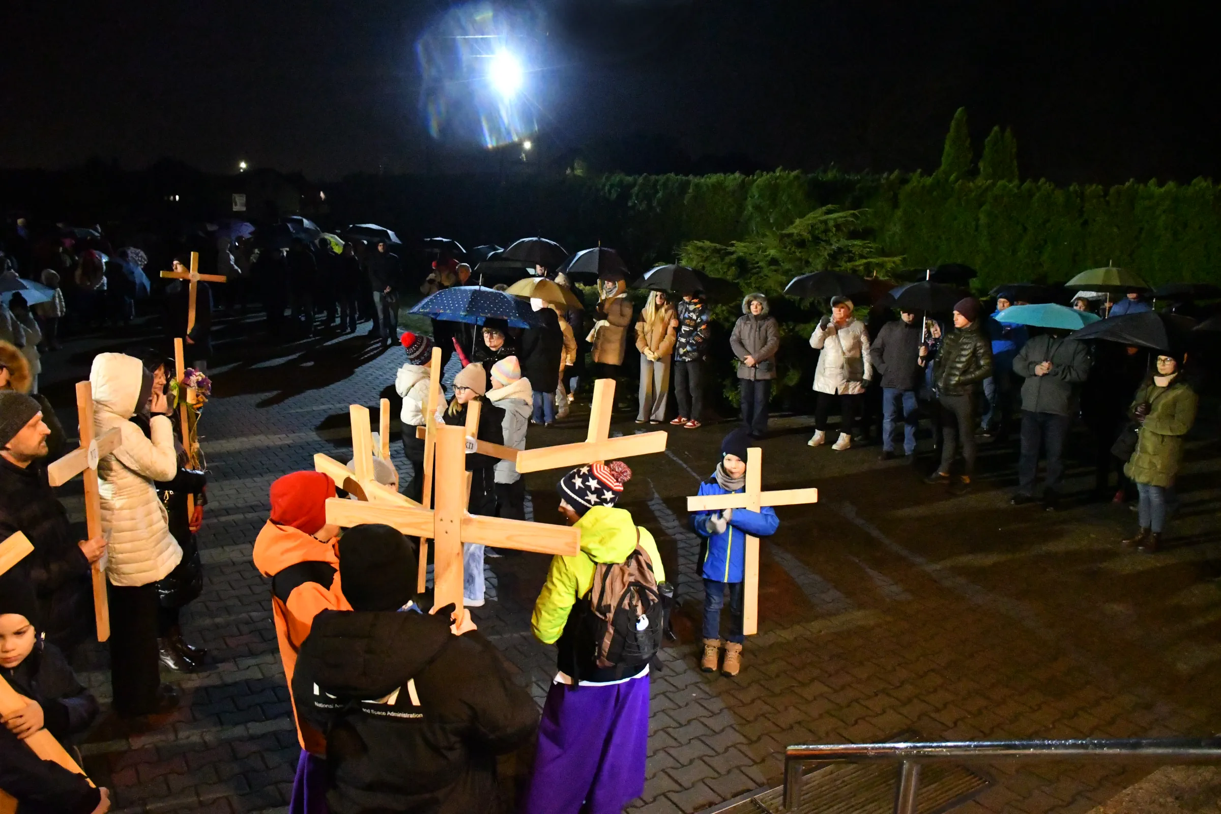 Przed wyruszeniem w drogę do czternastu stacji Drogi Krzyżowej część wiernych odebrała przygotowane wcześniej drewniane krzyże – te same, które towarzyszą Gostynianom od pierwszego przemarszu w 2022 roku – a inni, zgodnie z tą samą tradycją, zapalili przyniesione przez siebie świece, głównie ledowe. W tym roku najwięcej krzyży stacyjnych zdecydowało się nieść najmłodsze pokolenie parafian, choć nie zabrakło też nieco starszych wiekiem osób, które czynią to z najwyższą czcią każdego roku.