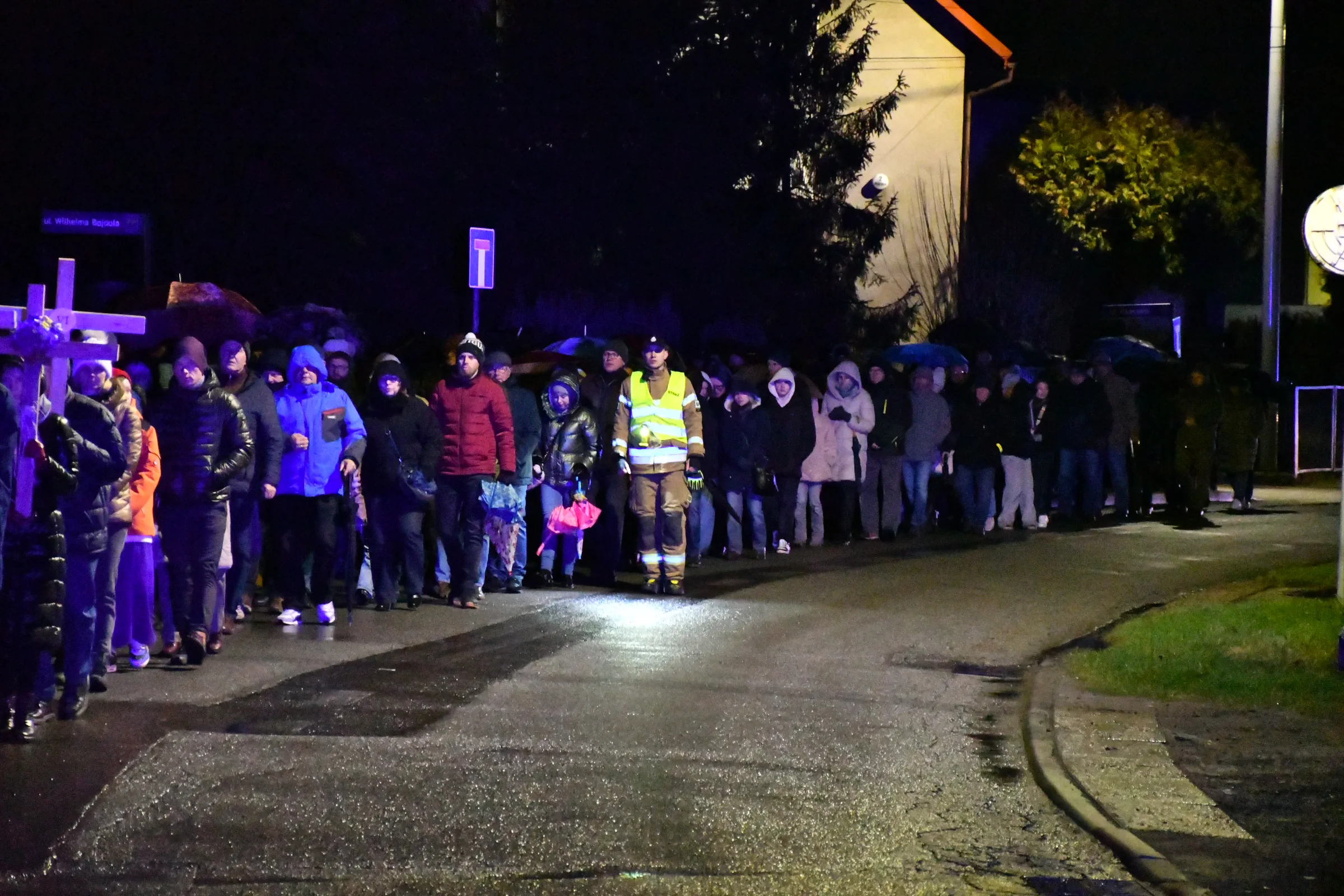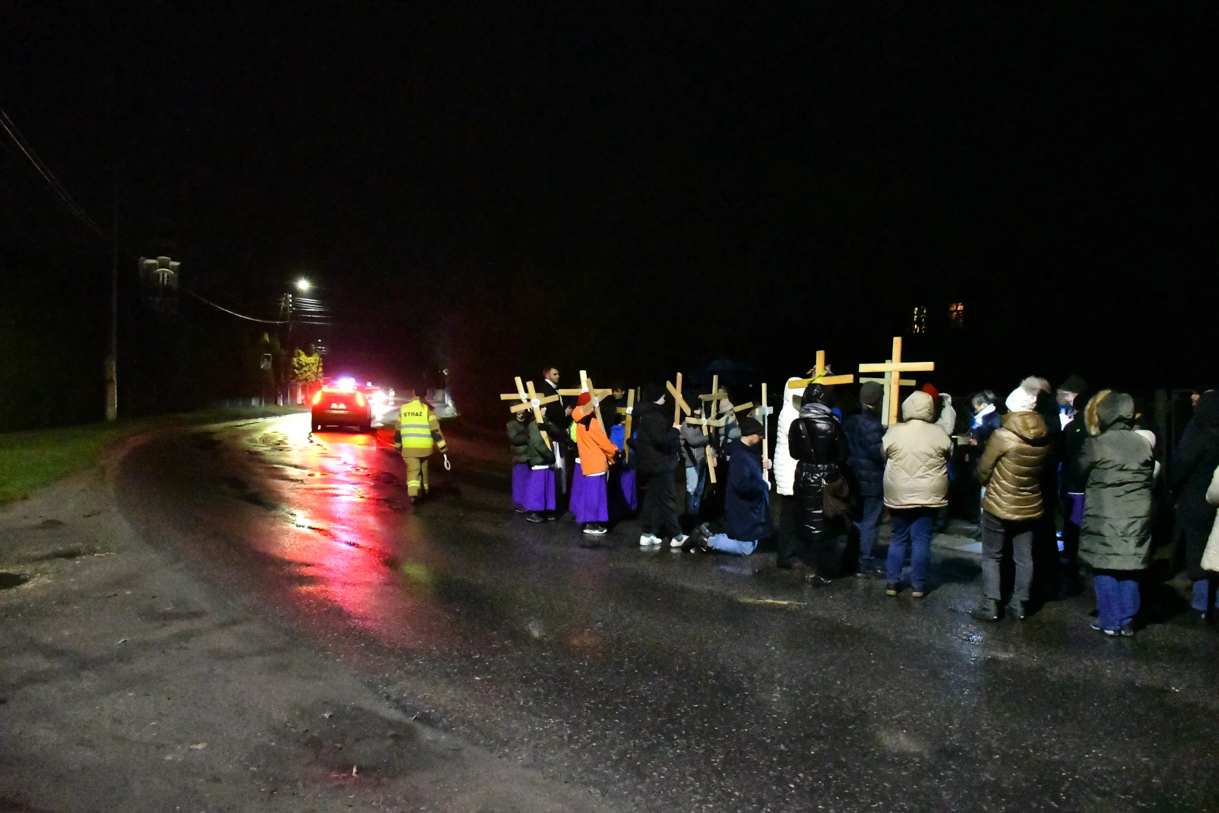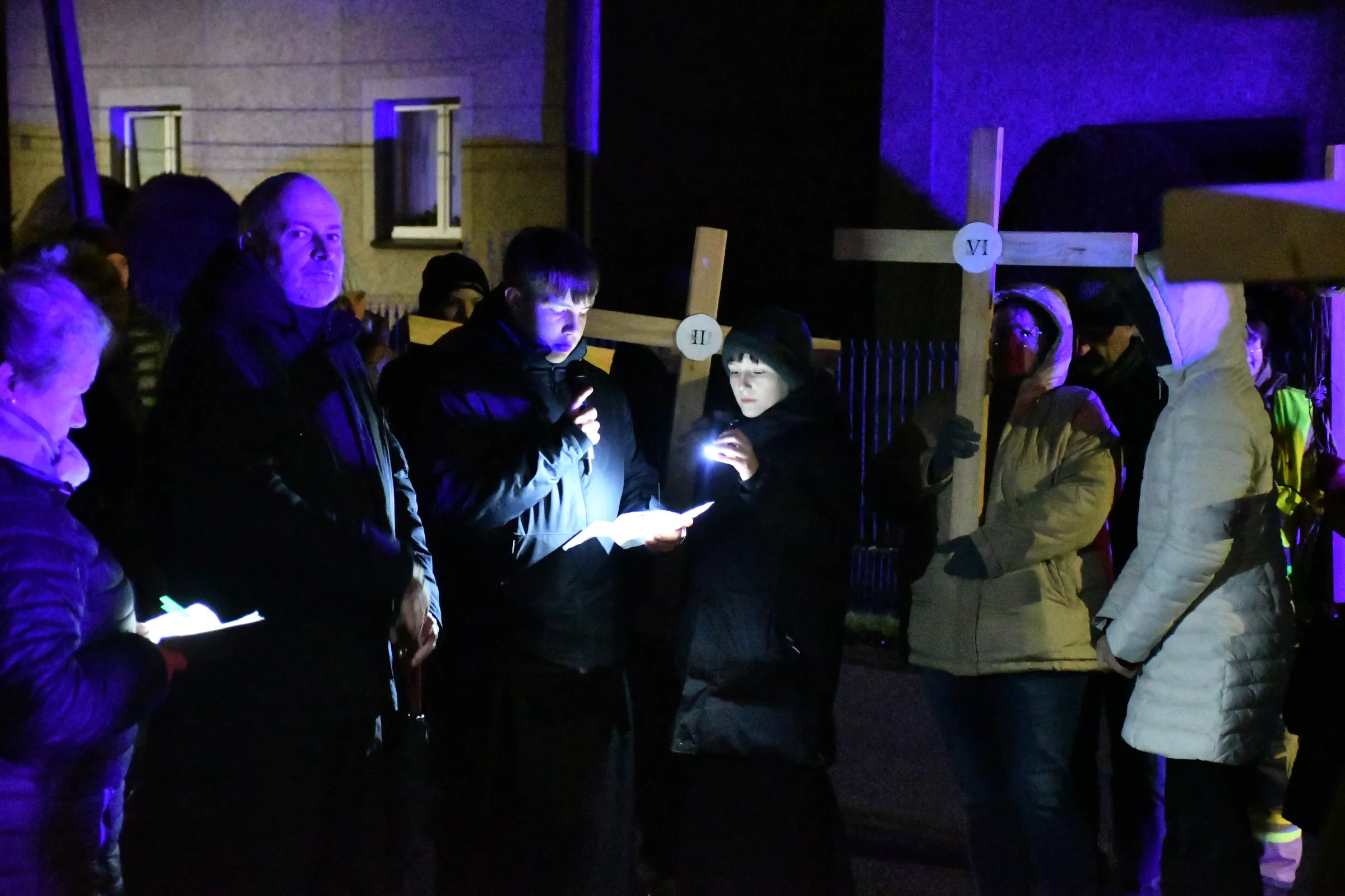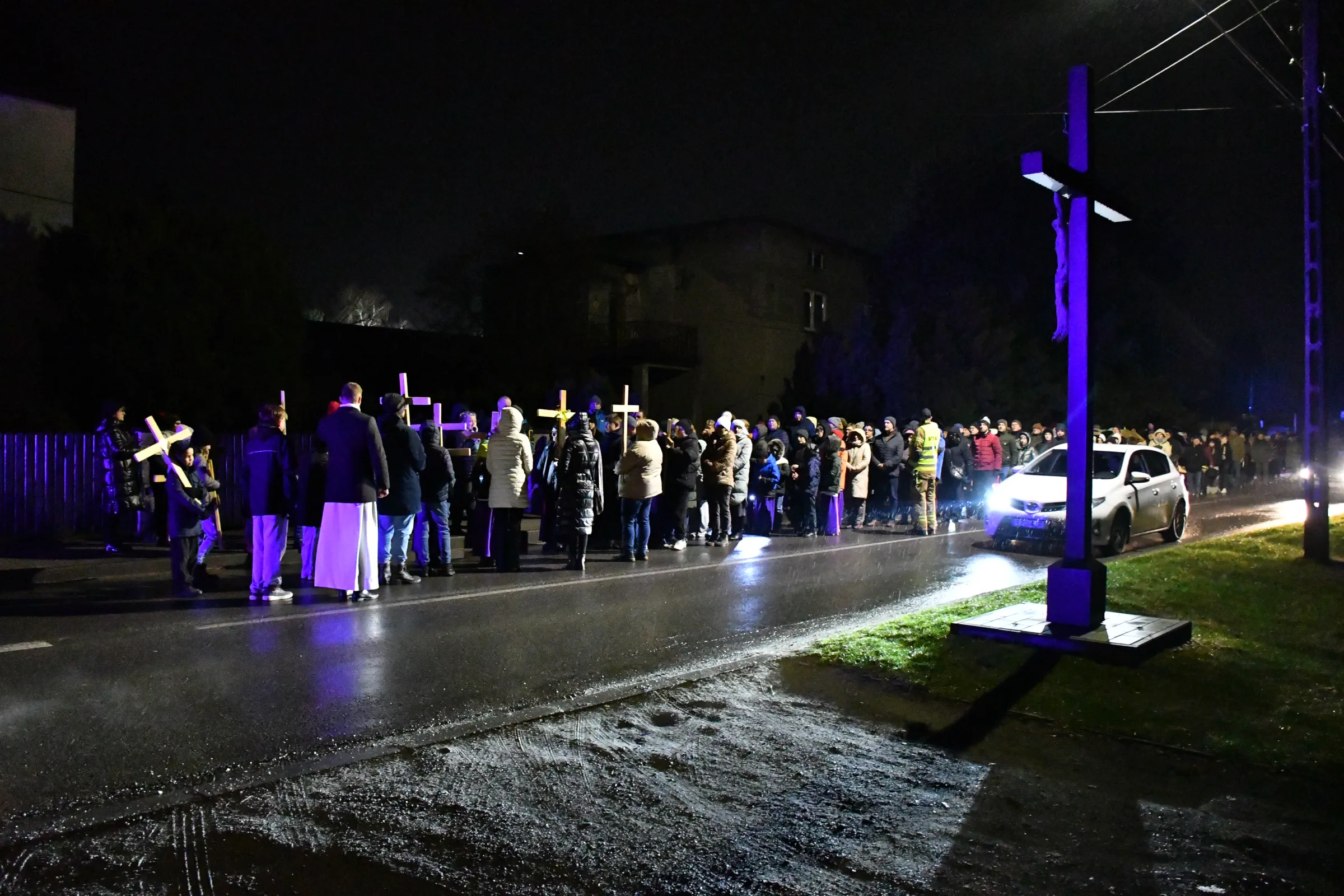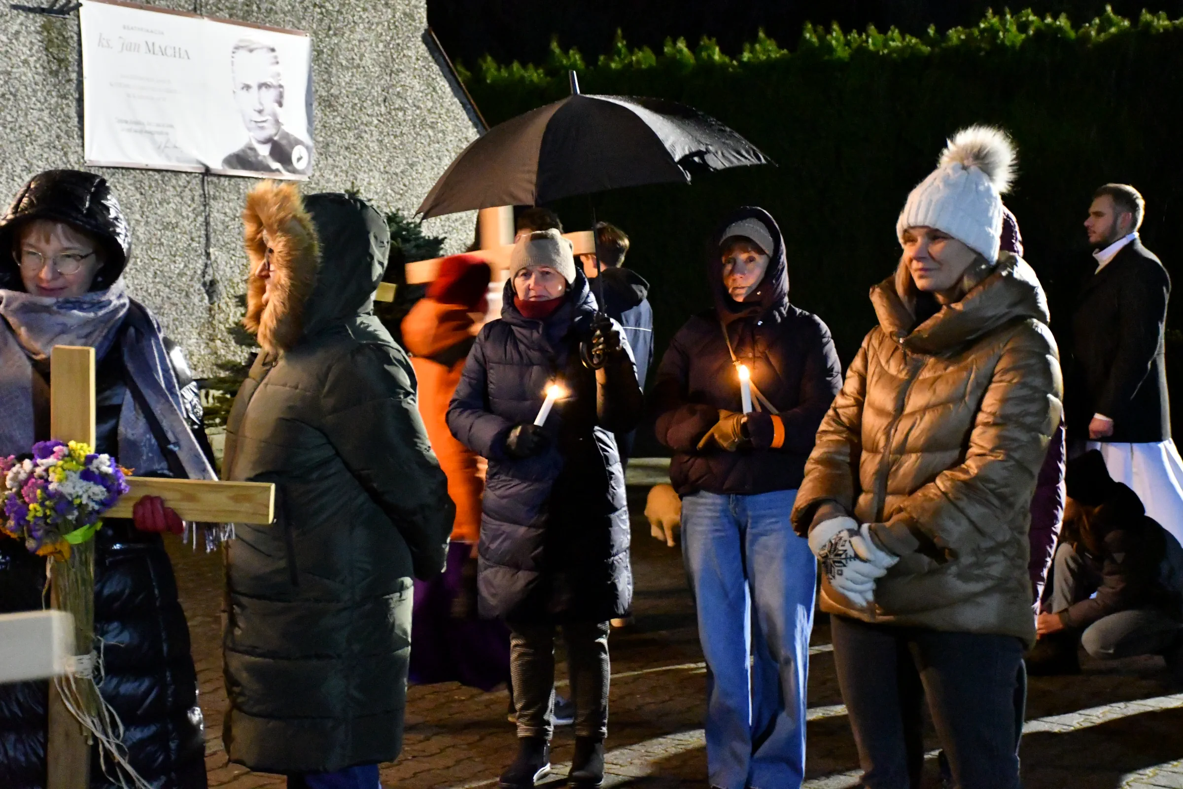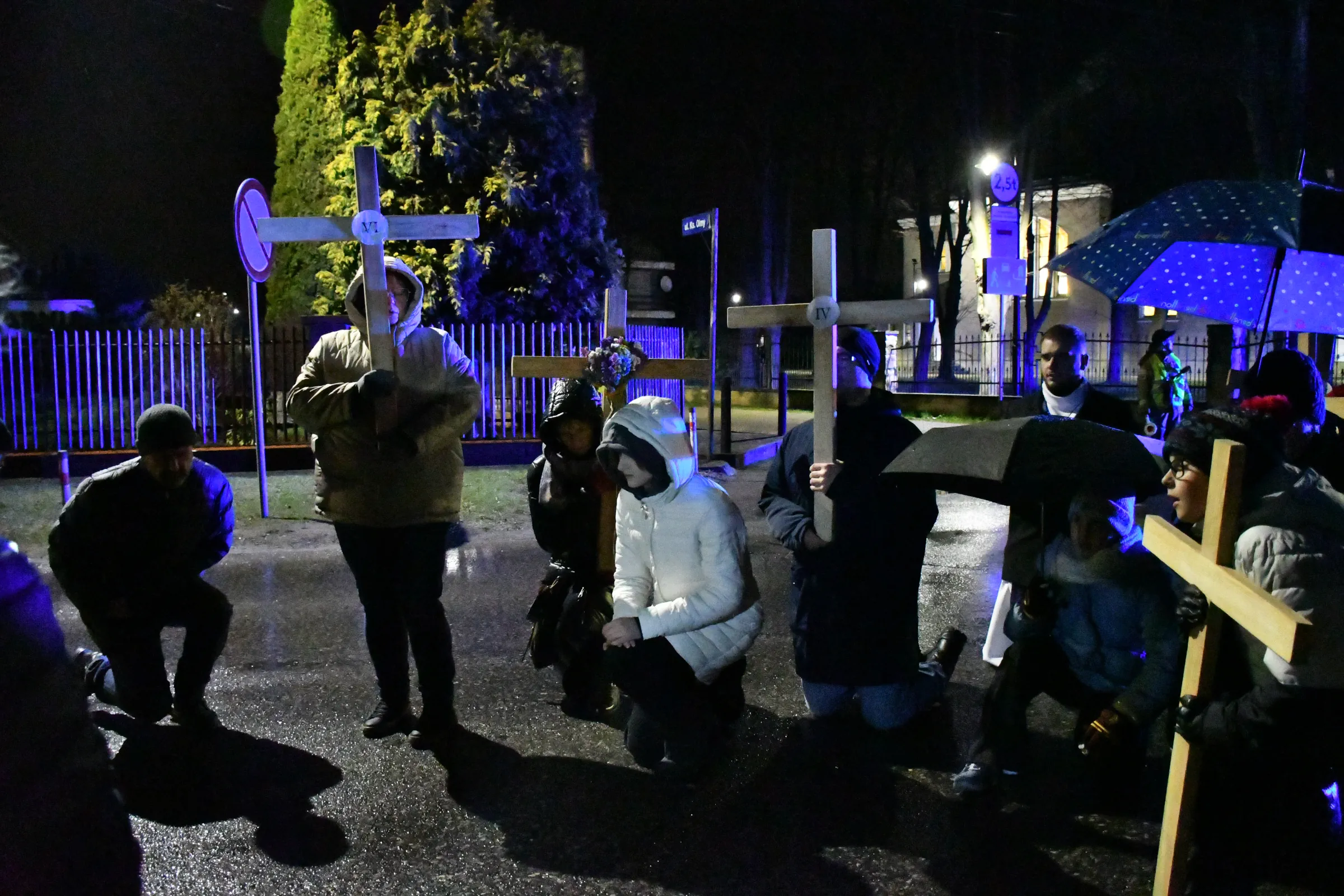 Przed wyruszeniem w drogę do czternastu stacji Drogi Krzyżowej część wiernych odebrała przygotowane wcześniej drewniane krzyże – te same, które towarzyszą Gostynianom od pierwszego przemarszu w 2022 roku – a inni, zgodnie z tą samą tradycją, zapalili przyniesione przez siebie świece, głównie ledowe. W tym roku najwięcej krzyży stacyjnych zdecydowało się nieść najmłodsze pokolenie parafian, choć nie zabrakło też nieco starszych wiekiem osób, które czynią to z najwyższą czcią każdego roku.