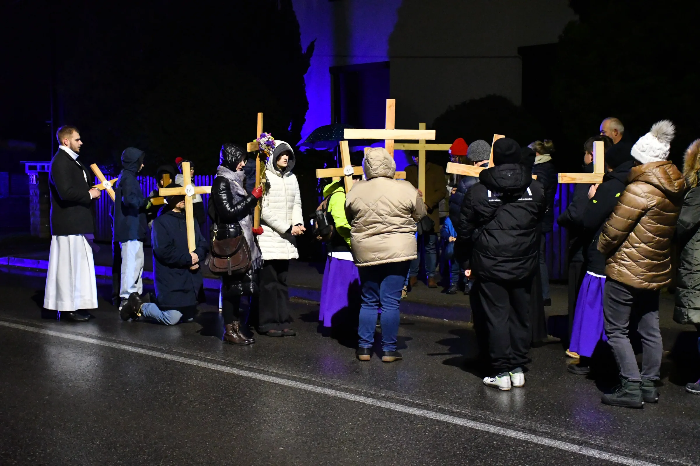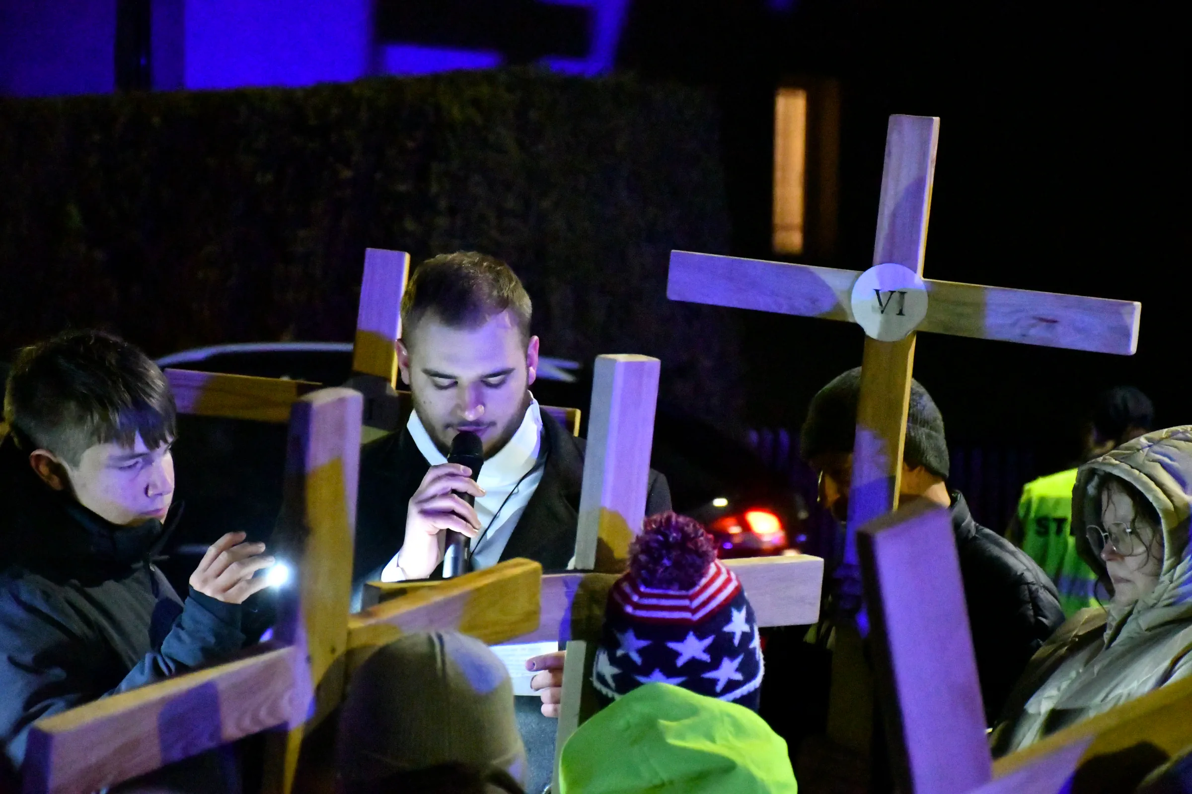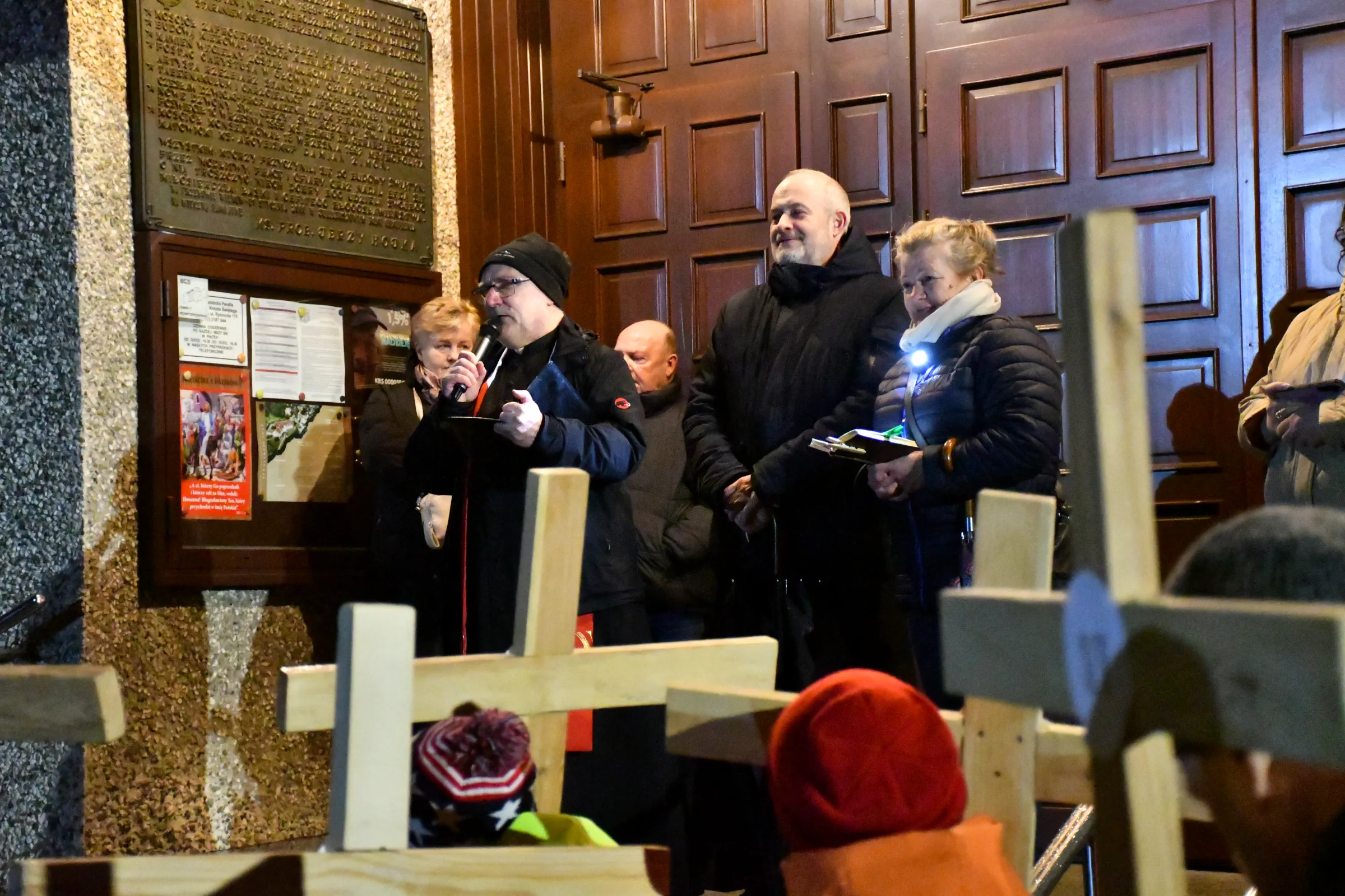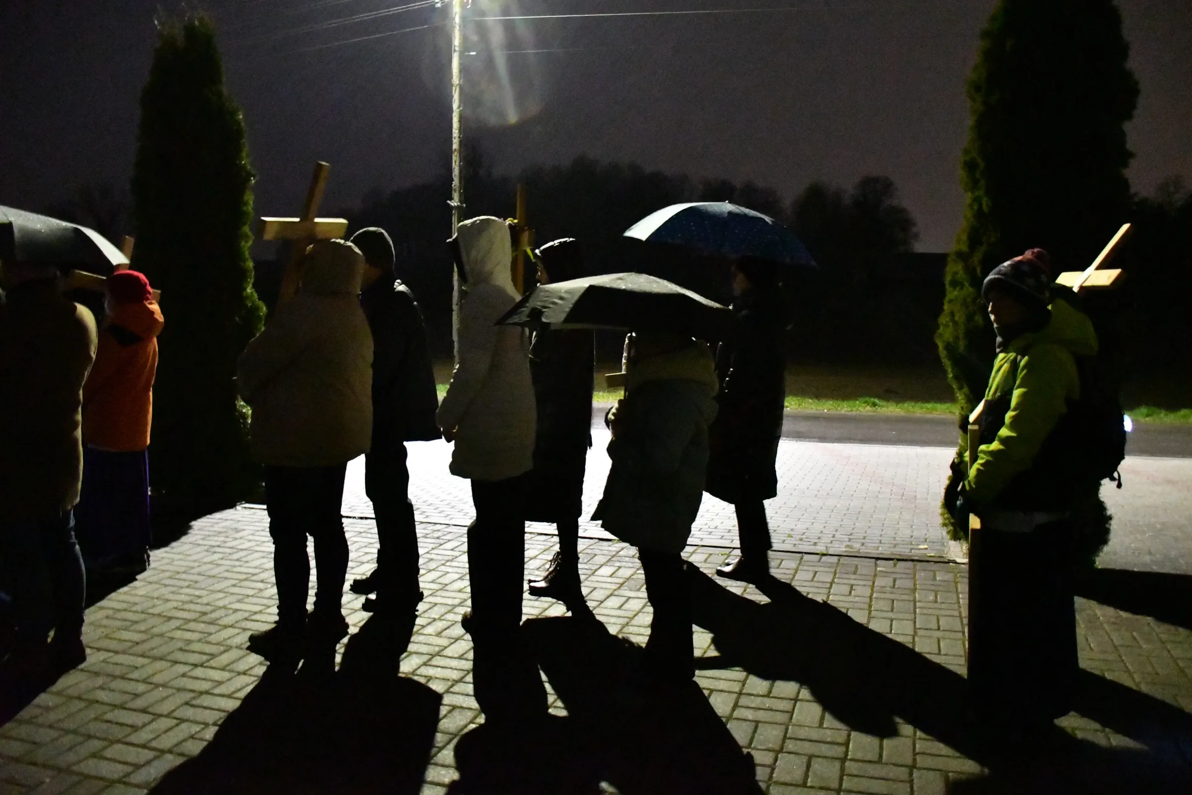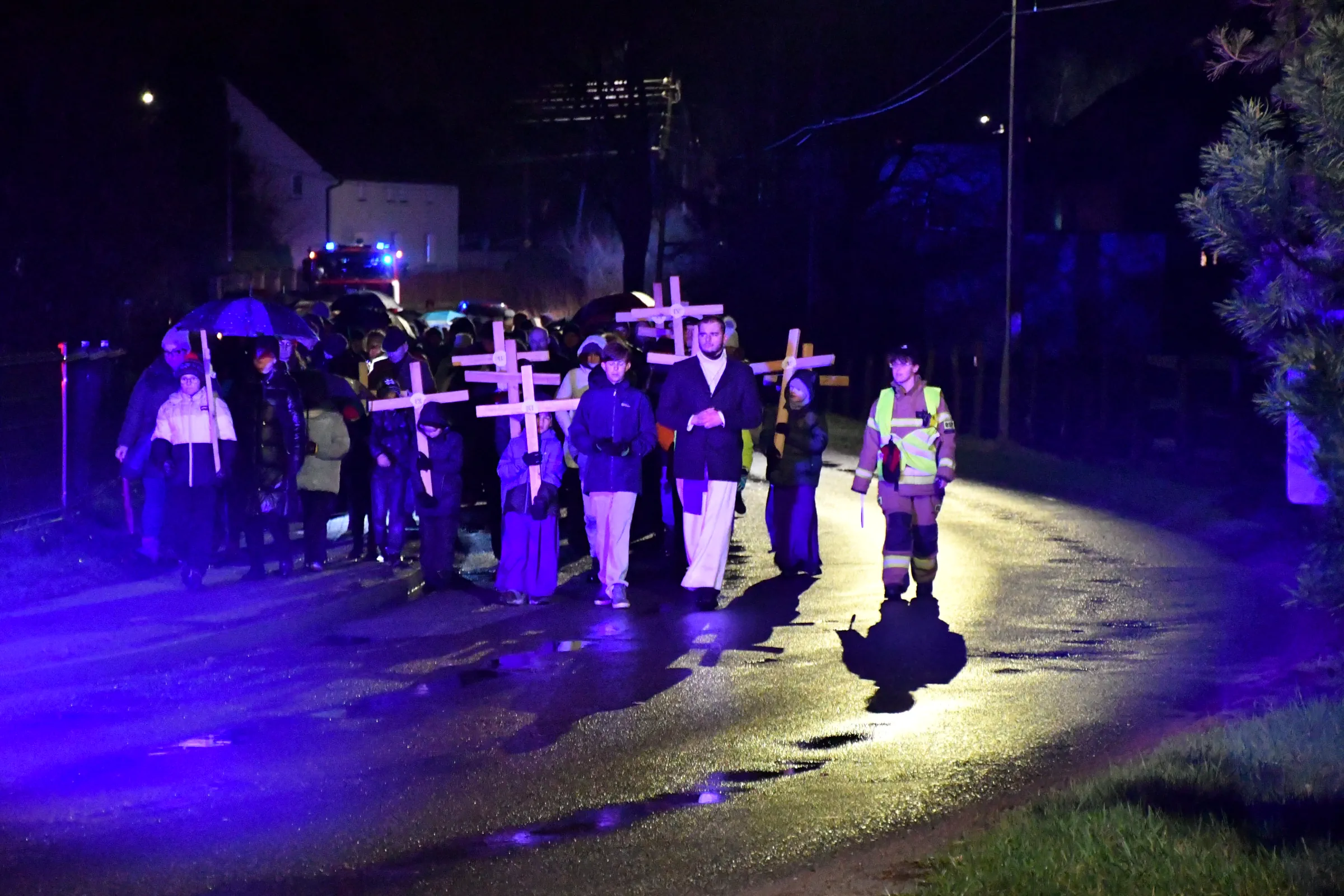 Przed wyruszeniem w drogę do czternastu stacji Drogi Krzyżowej część wiernych odebrała przygotowane wcześniej drewniane krzyże – te same, które towarzyszą Gostynianom od pierwszego przemarszu w 2022 roku – a inni, zgodnie z tą samą tradycją, zapalili przyniesione przez siebie świece, głównie ledowe. W tym roku najwięcej krzyży stacyjnych zdecydowało się nieść najmłodsze pokolenie parafian, choć nie zabrakło też nieco starszych wiekiem osób, które czynią to z najwyższą czcią każdego roku.