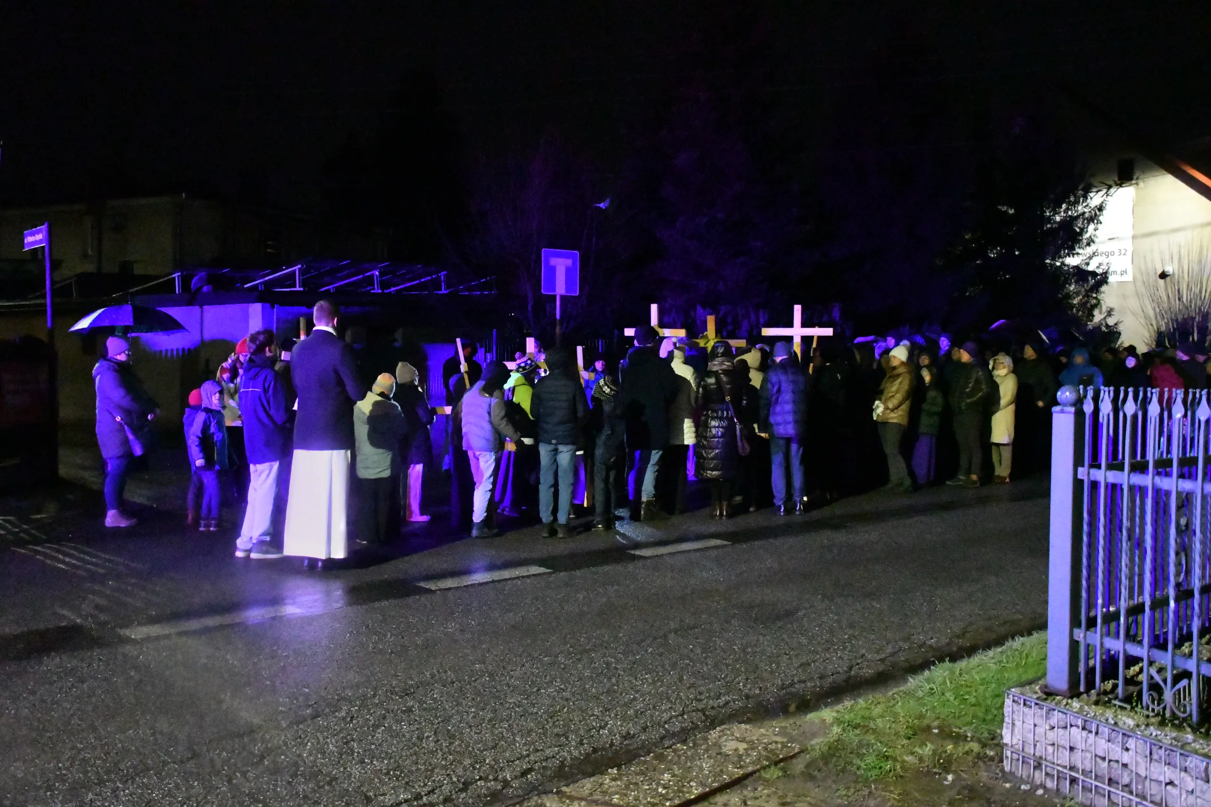 Uczestnicy procesji Drogi Krzyżowej zebrali się przed kościołem pw. Podwyższenia Krzyża Św. o godz. 19.00. Wiernych z obu parafii, przybyłych mimo przelotnego deszczu i odczuwalnego chłodu, przywitał ks. prob. Henryk Nowara, zapraszając do wspólnej modlitwy, refleksji i szukania duchowego umocnienia.