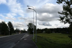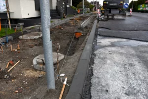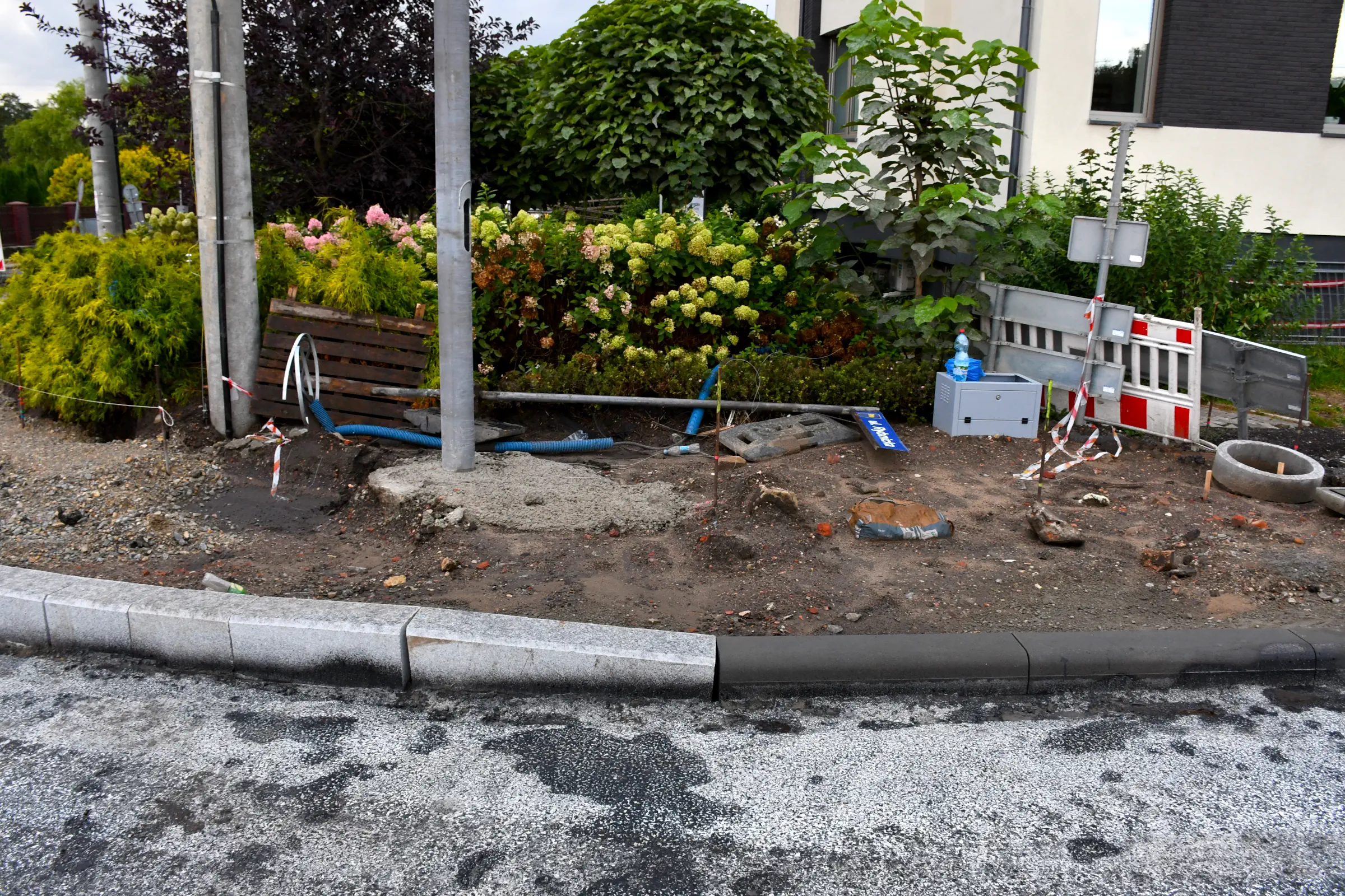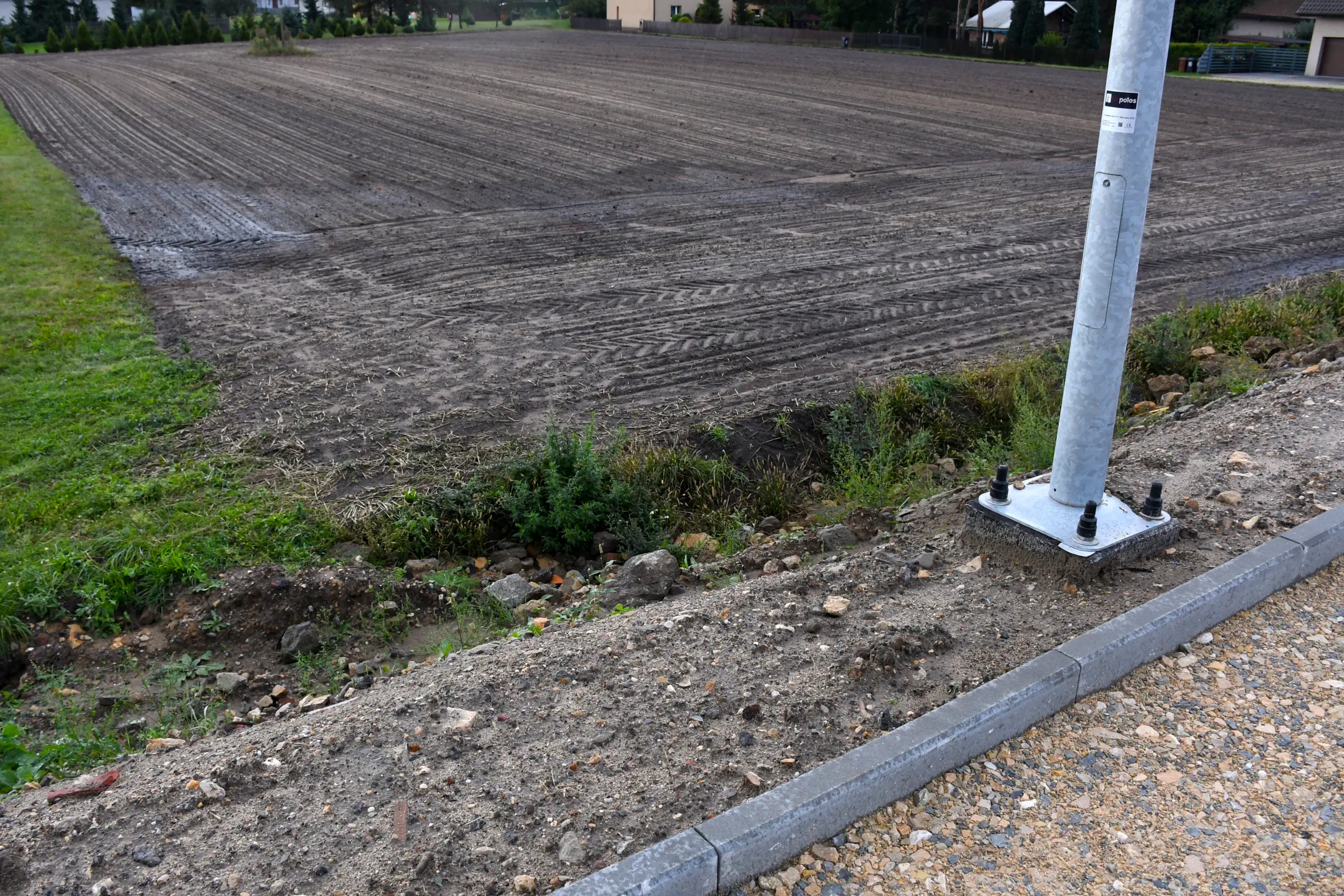 6. W rejonie skrzyżowania z ul. Miarową osadzono brakujące fundamenty słupów oświetleniowych, na których wkrótce potem zamontowano słupy wraz z oprawami. W połowie miesiąca wykonano warstwę wiążącą na zjeździe na ul. Miarową powiatową, a po przeciwnej stronie przy ul. Miarowej gminnej dokończono budowę chodnika.