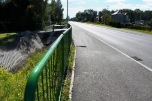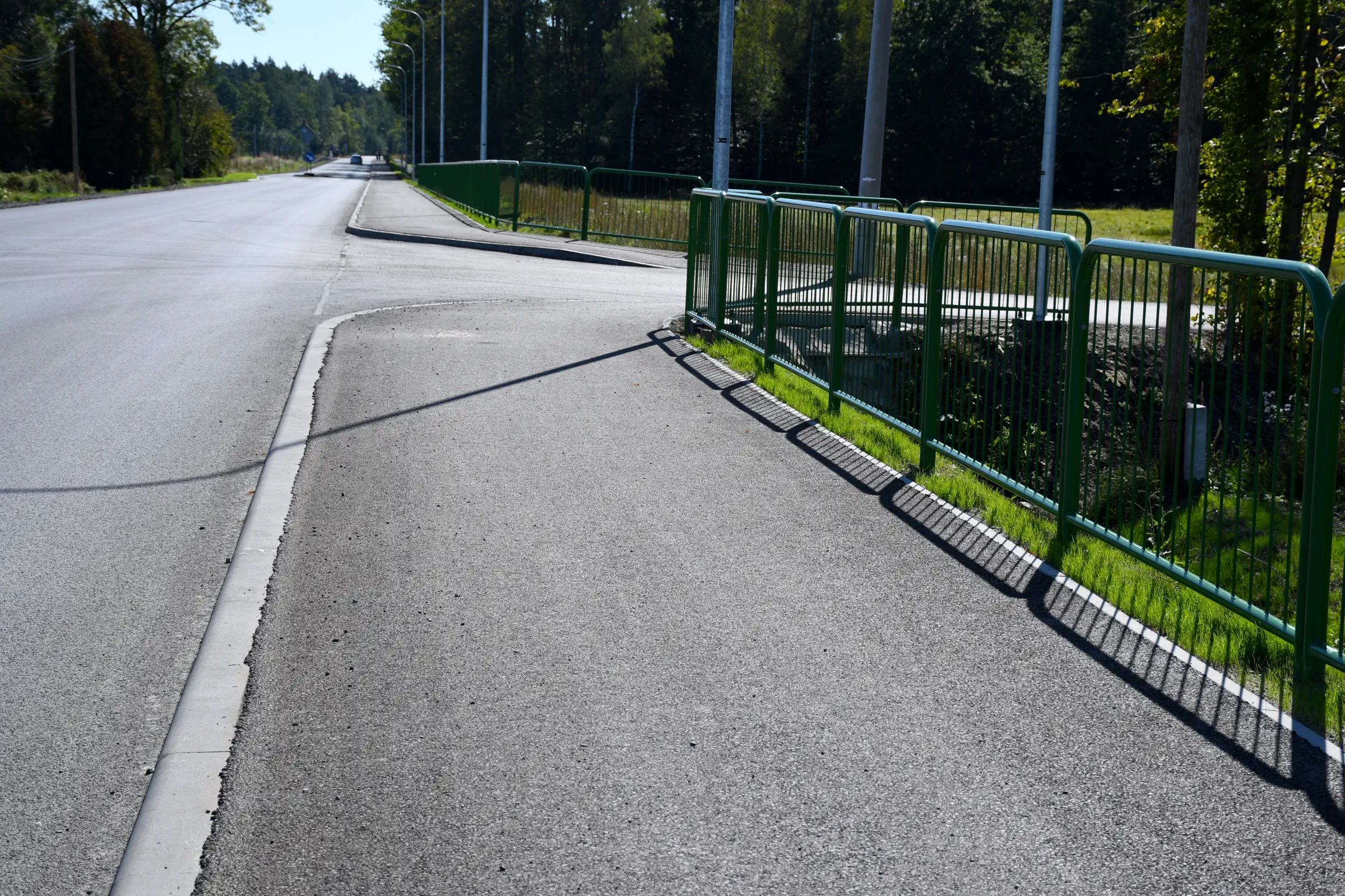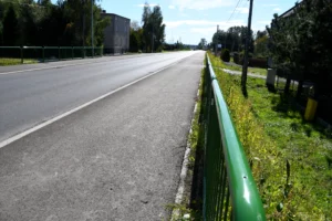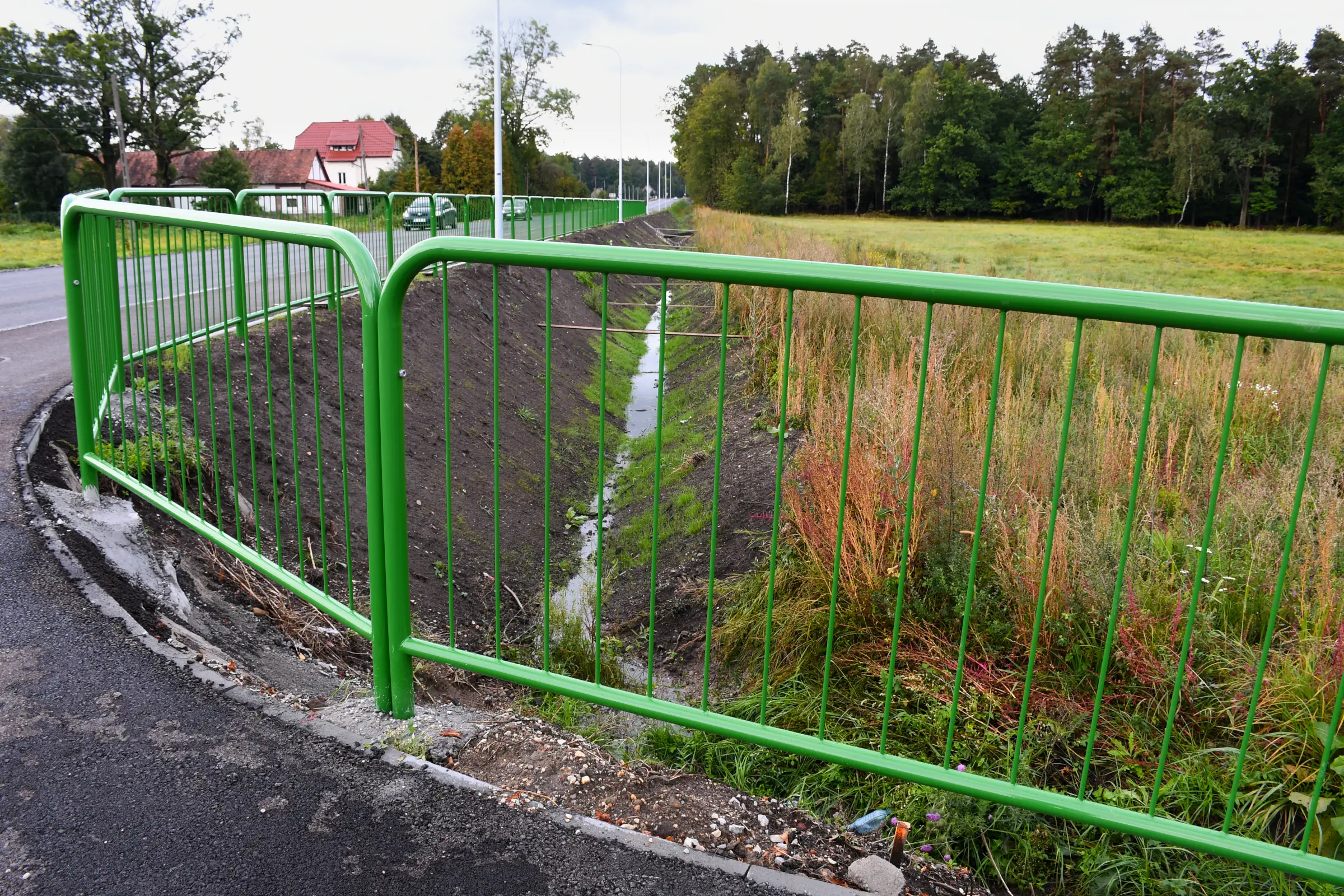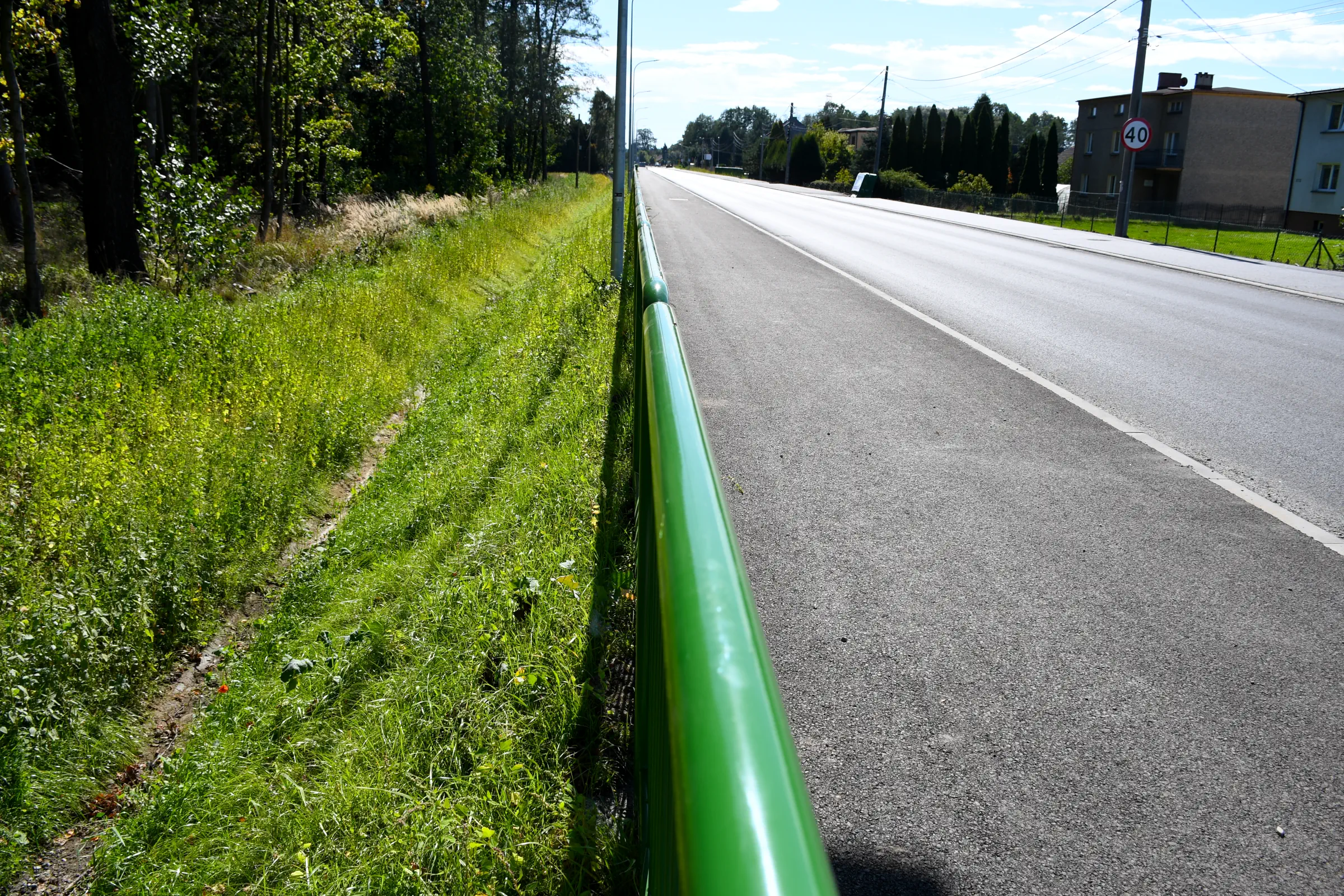 5. Wzdłuż całego odcinka przy zjeździe na ul. Zaleśną – po stronie wschodniej – również zamontowano barierki drogowe. Ponadto pomiędzy zjazdami na łąki i pola – które znajdują się po przeciwnej stronie do zjazdu na ul. Zaleśną – oraz leśniczówką, wzdłuż rowu melioracyjnego po stronie wschodniej zainstalowano bariery energochłonne.