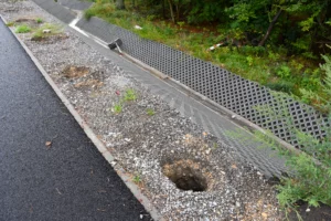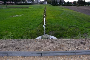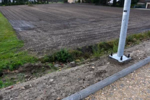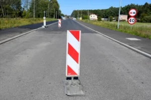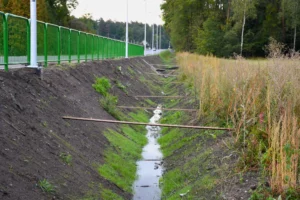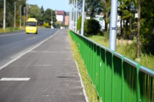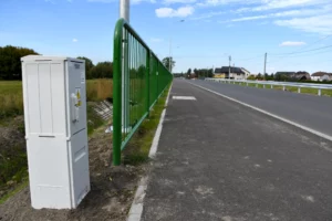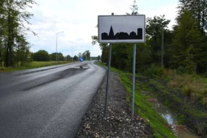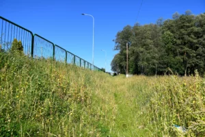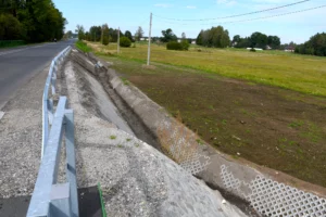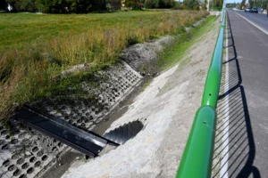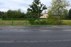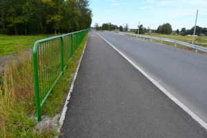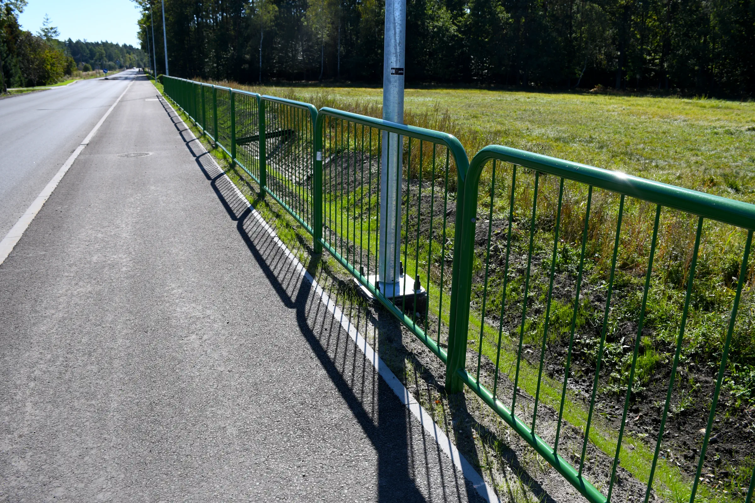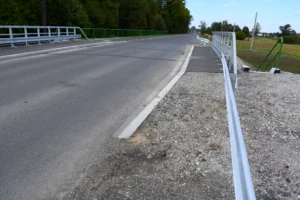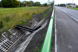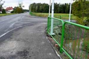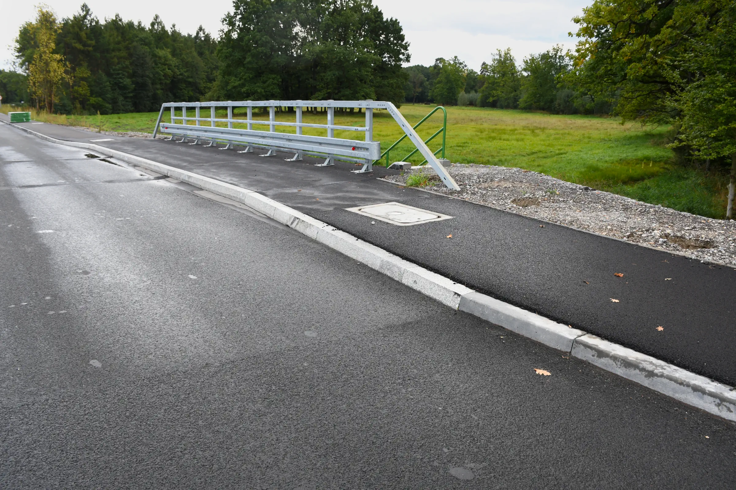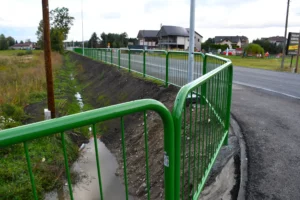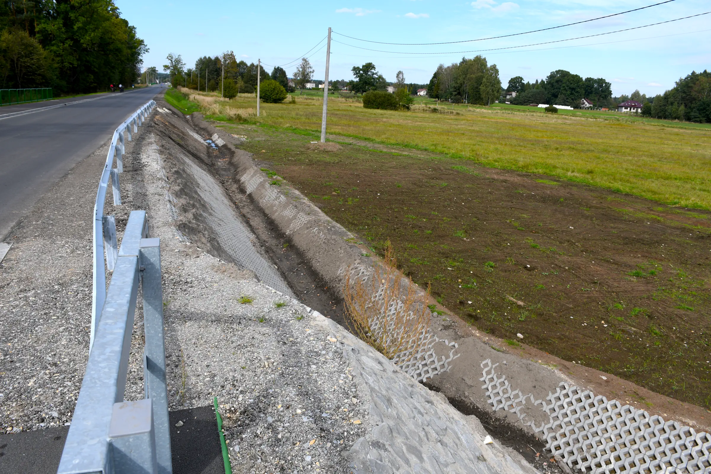 5. Wzdłuż całego odcinka przy zjeździe na ul. Zaleśną – po stronie wschodniej – również zamontowano barierki drogowe. Ponadto pomiędzy zjazdami na łąki i pola – które znajdują się po przeciwnej stronie do zjazdu na ul. Zaleśną – oraz leśniczówką, wzdłuż rowu melioracyjnego po stronie wschodniej zainstalowano bariery energochłonne.
