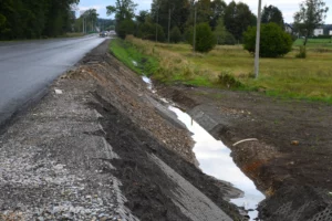 11. Na odcinku w obrębie zjazdu na ul. Łuczników dokończono budowę ciągu pieszo-rowerowego po stronie budynku Ochotniczej Straży Pożarnej w Gostyni. Poza tym w połowie miesiąca wykonano ścieralną warstwę asfaltu na zjeździe na ul. Łuczników, a w pobliżu zjazdu po obu stronach drogi zamontowano barierki drogowe wzdłuż rowu melioracyjnego po stronie wschodniej i niewielkiej skarpy po drugiej stronie. Ponadto obsypano ziemią płyty ażurowe stanowiące wzmocnienie koryta ww. rowu.