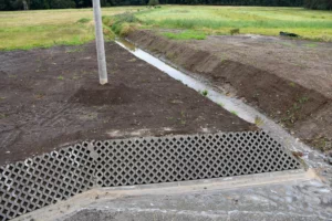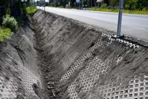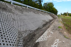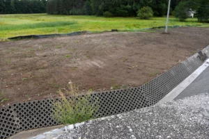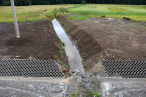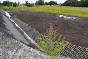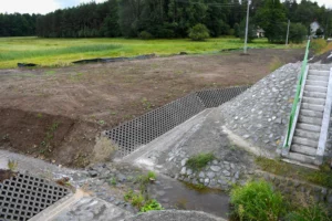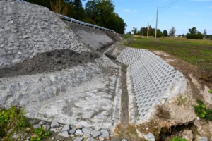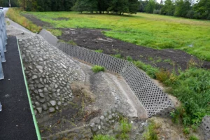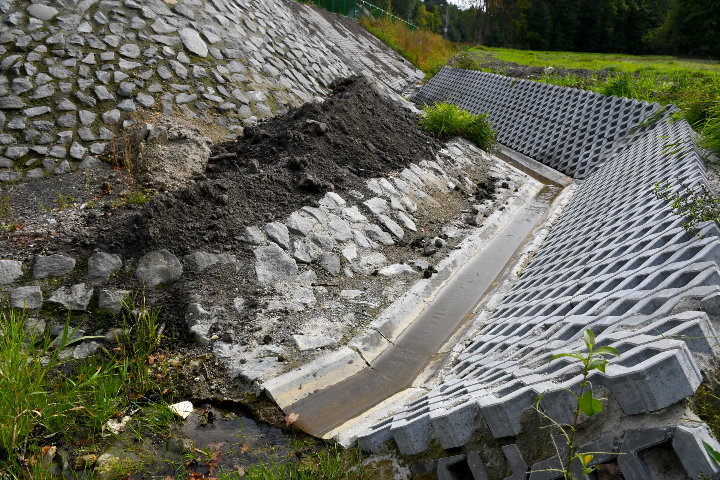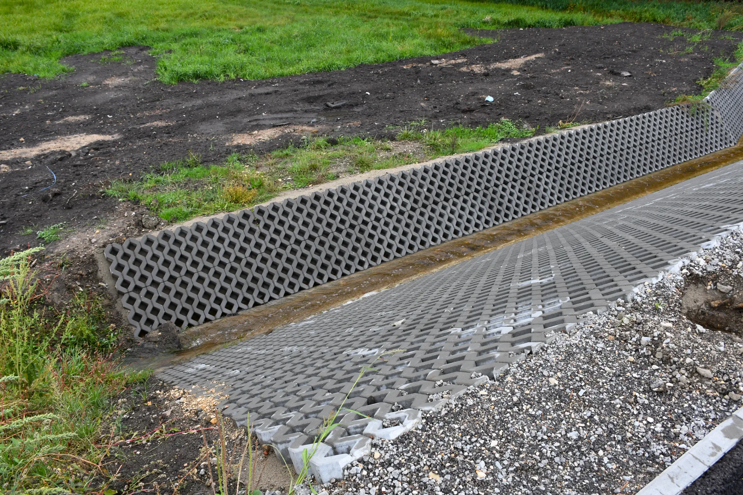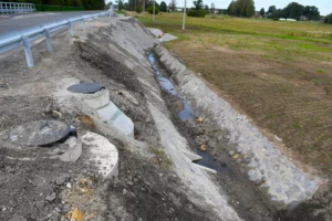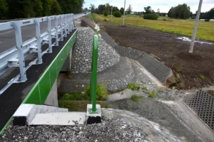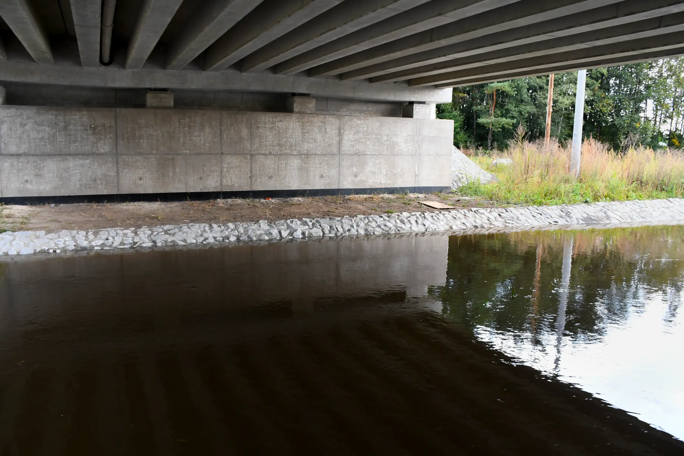 3. Na przełomie sierpnia i września wyrównano teren po obu stronach mostu nad ciekiem leśnym (obiekt M3) i ostatecznie uformowano koryto cieku po stronie wschodniej mostu. W kolejnych tygodniach września przy moście zamontowano bariery energochłonne (strona wschodnia) i barierki drogowe (strona zachodnia, tj. od strony lasu). Poza tym rozpoczęto zasypkę ażurowego umocnienia rowów po obu stronach.
