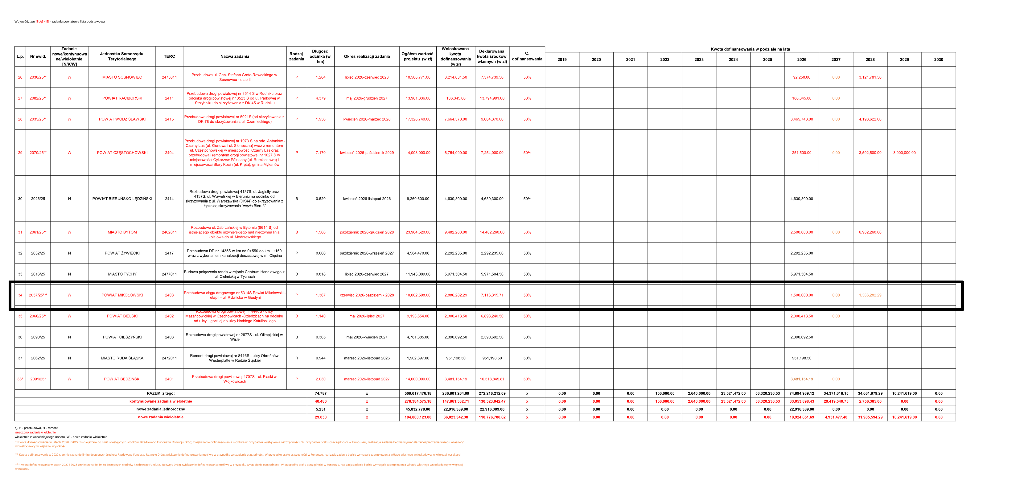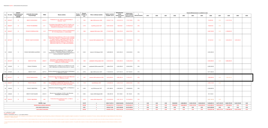 Jak wynika z zestawienia zatwierdzonego tydzień temu przez Ministerstwo Infrastruktury2, realizację przebudowy tego etapu zaplanowano od czerwca 2026 roku do października 2028 roku, a to przy założeniu, że prace będą kosztować 10 002 598 zł. Wnioskowana kwota dofinansowania wynosi 2 886 282,29 zł, co obecnie stanowi 28,86% wartości inwestycji, natomiast deklarowany wkład własny powiatu to 7 116 315,71 zł (71,14%).