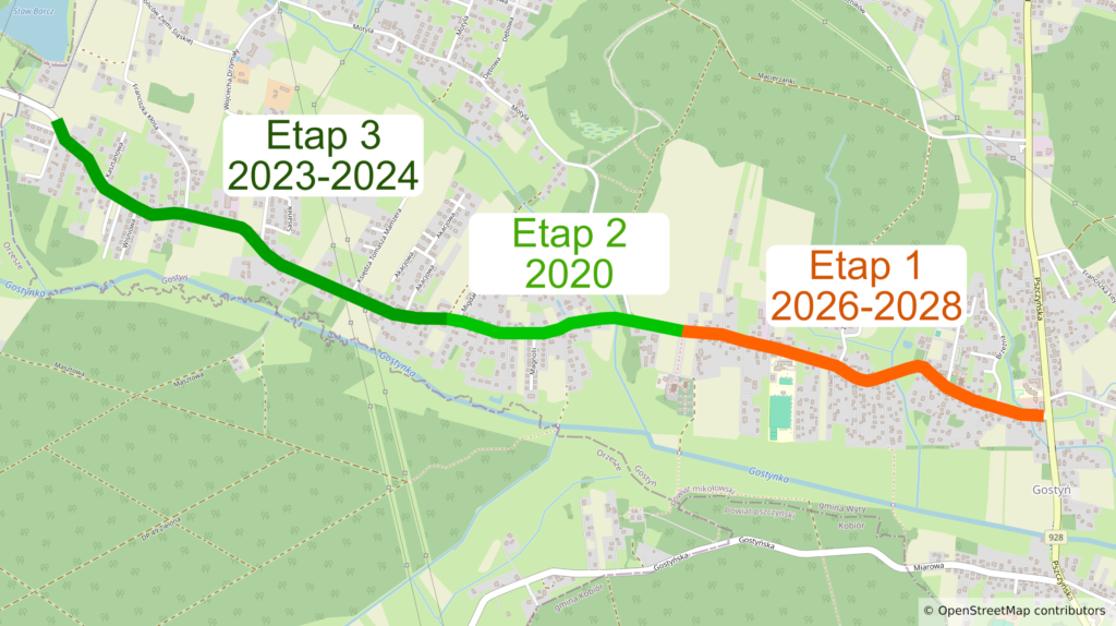 Ostatnim odcinkiem wymagającym remontu jest odcinek oznaczony w dokumentacji jako etap 1 o długości prawie 1,4 km – od skrzyżowania z ul. Pszczyńską (wyremontowana droga wojewódzka nr 928) do wyjazdu z terenu parafii Podwyższenia Krzyża Św. Pozostałe odcinki – etap 2 i etap 3 – były realizowane w latach 2020 i 2023-2024.